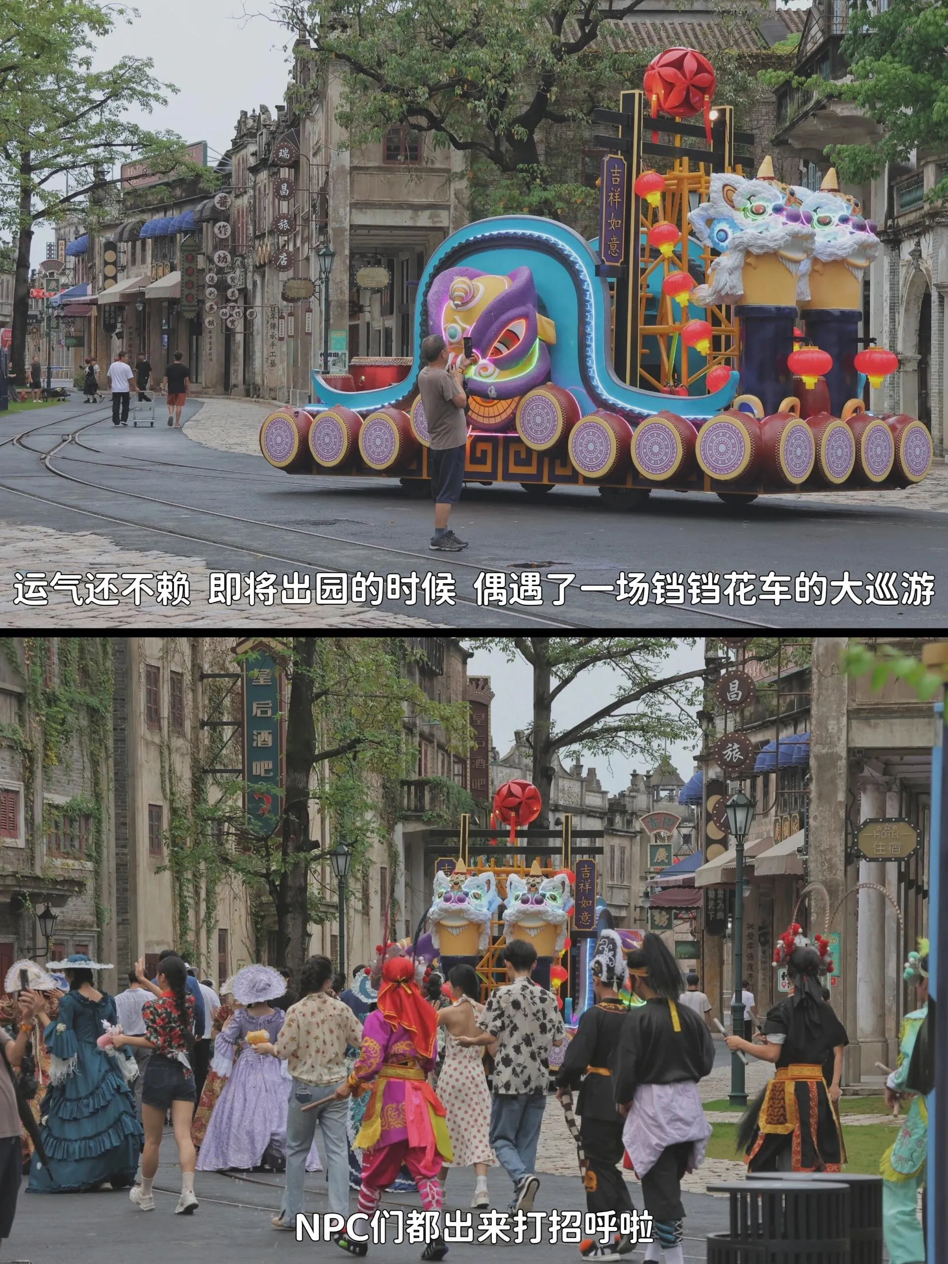 当音乐响起舞台灯光亮起,真的像是一秒走进了曾经的夜上海大舞台。一代宗师各宗派汇集一决高下,当古镇遇上古代功夫,这氛围感就来了。运气还不错,在即将出园的时候还偶遇了复古铛铛车和NPC巡游的队伍。