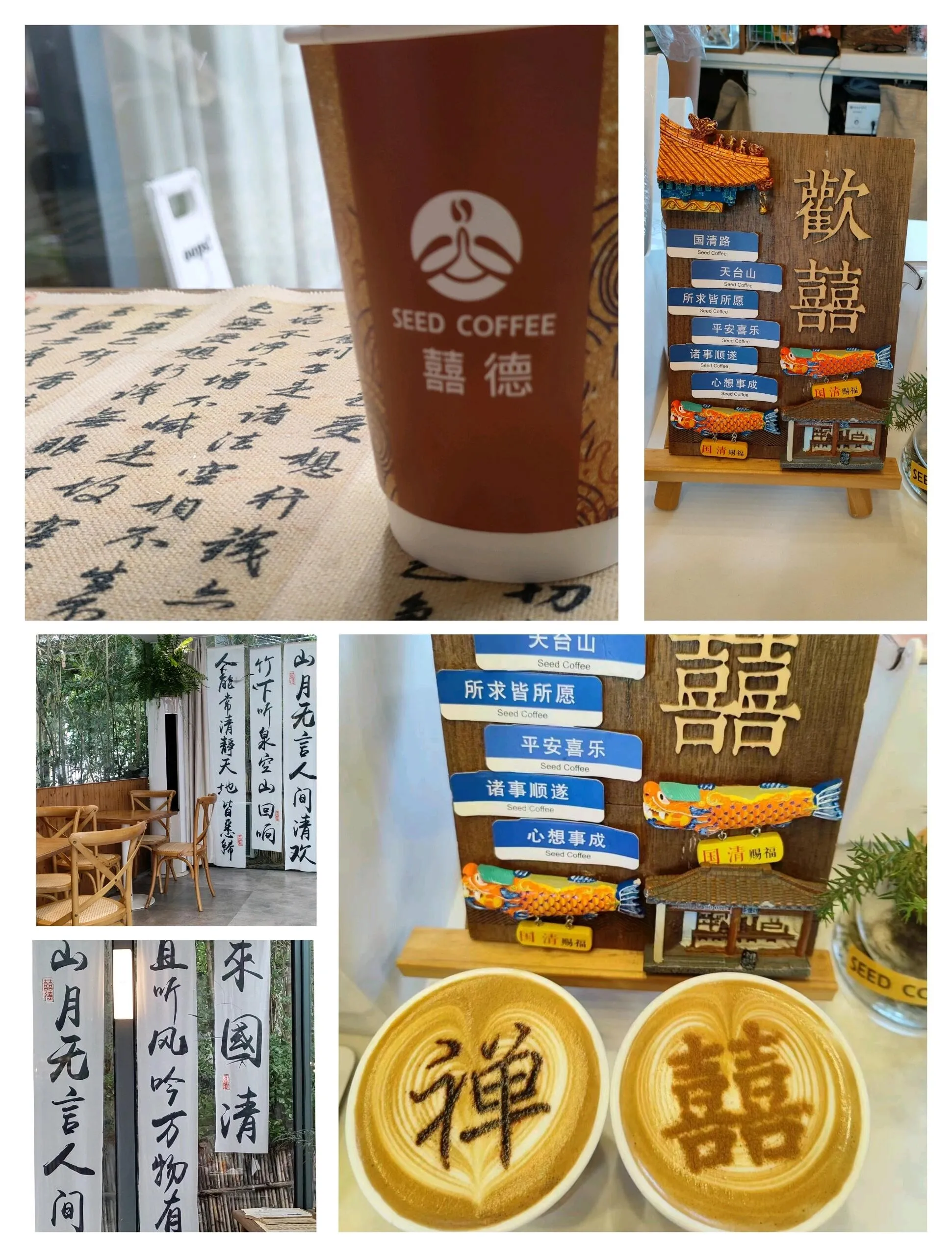 离开国清寺后,沿着步道步行约10分钟,就能到达一家网红咖啡馆。 这里环境优雅,店面宽敞,座位充足,院子里还设有秋千。 咖啡种类丰富,值得一试的有黑糖和肉桂口味。此外,店内还售卖明信片,每张2元。