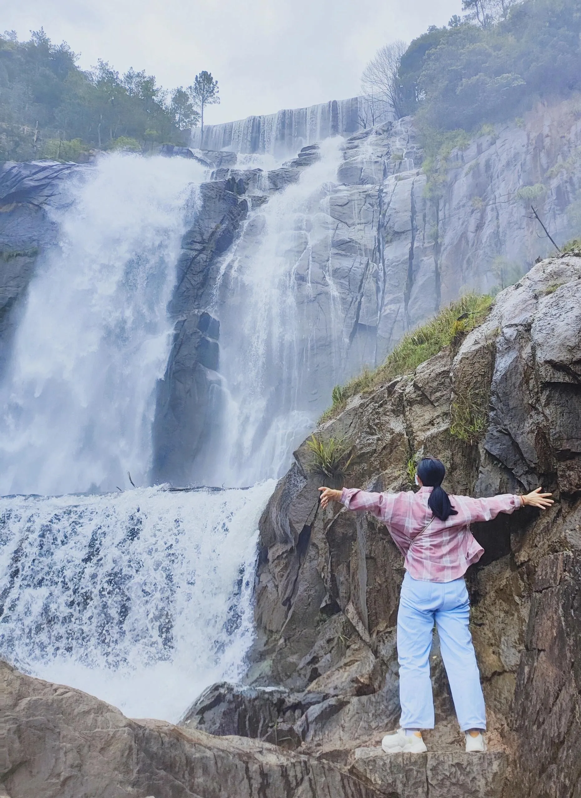 接下来的行程是天台山大瀑布。 建议提前在美团上购买门票,单独的大瀑布票价为100元。 如果时间充裕,可以考虑购买包含大瀑布、玻璃桥和仙台的联票,价格为165元,包含景区交通车。 从游客服务中心进入后,建议往右走前往大瀑布。沿途可以一路向上攀登至水帘洞,欣赏美景并拍照留念。