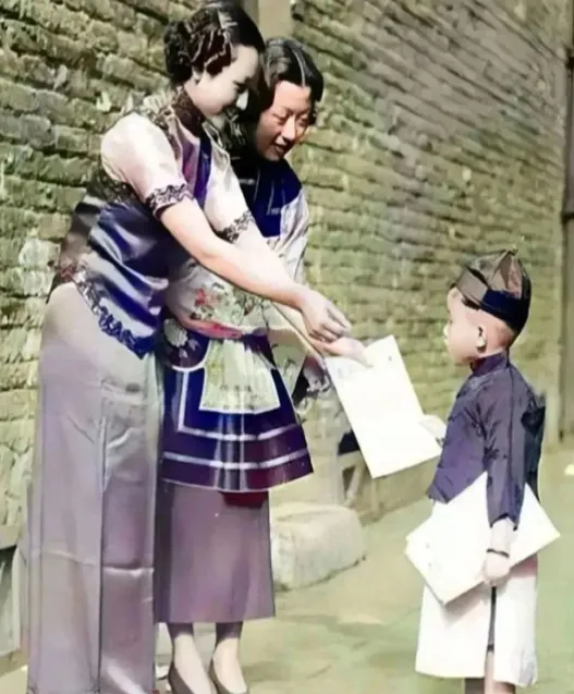 1934年的南京街头,两位打扮时髦的女子,卷发高跟鞋,手拿纸笔递给一位小学童。