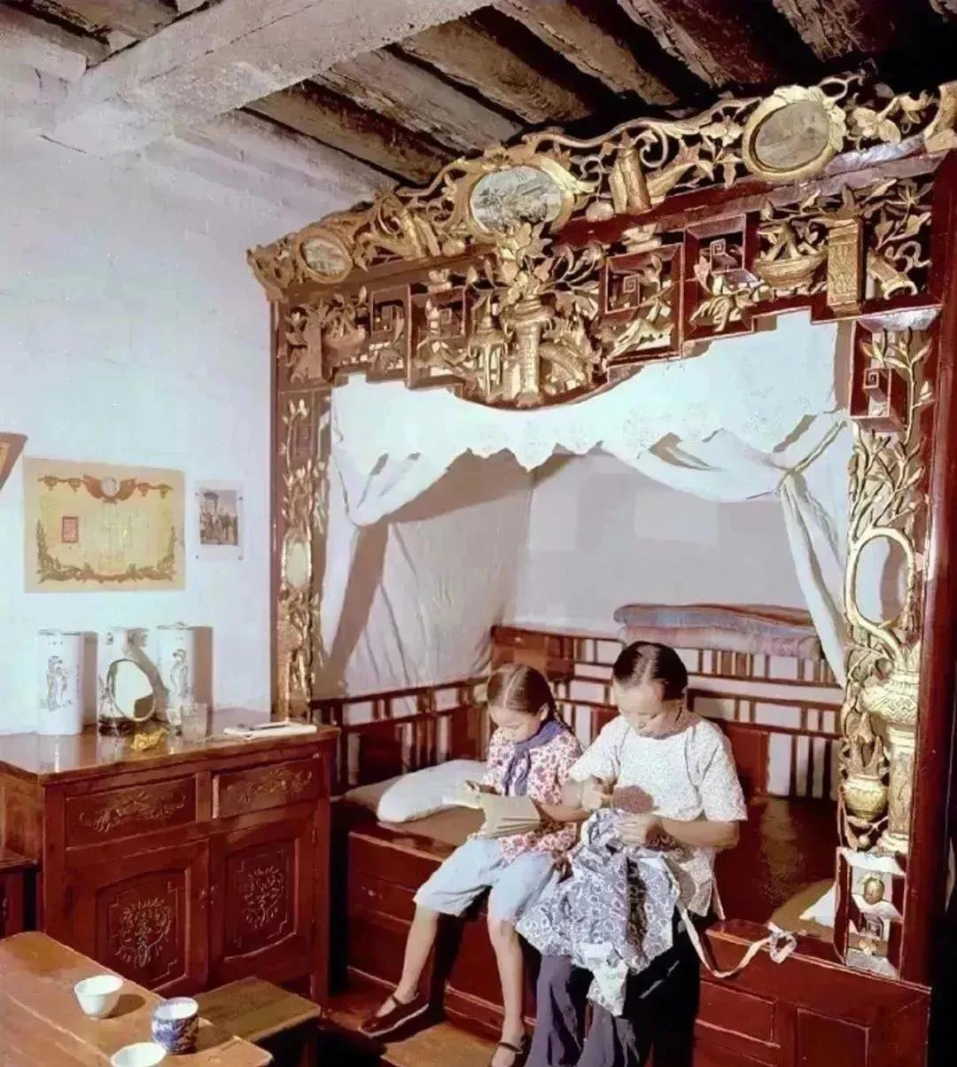 1959年,母亲正专心地缝补衣物,旁边的小女孩聚精会神地阅读书籍,显然出自大户人家,背景中的床也很华贵。