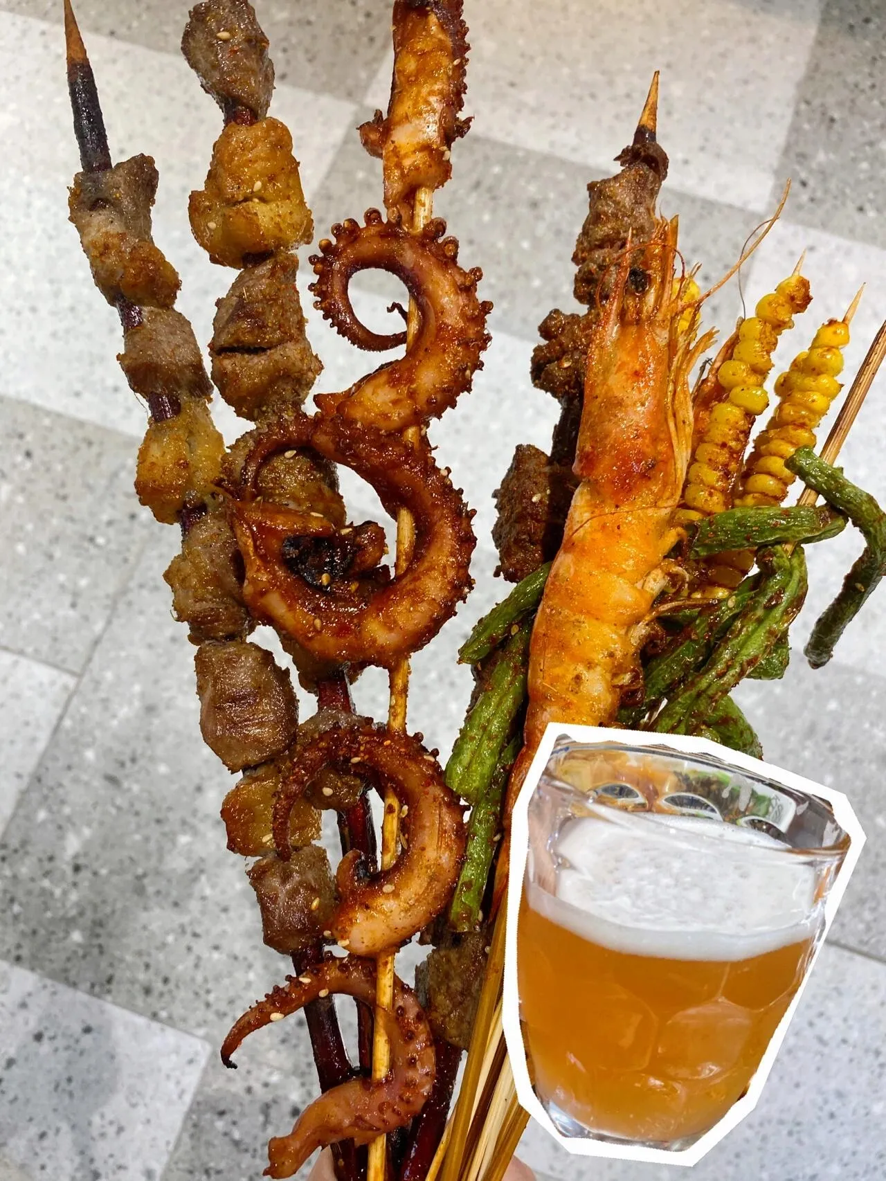 想不到美食街里面藏着这么好吃的烧烤。红柳羊肉串、牛肉串、烤大虾、章鱼足、小串玉米粒,再加上小酒馆的精酿白啤,搭配一绝!第一次尝试白啤,特别好喝,居然有淡淡的水果味,一点也不苦涩。