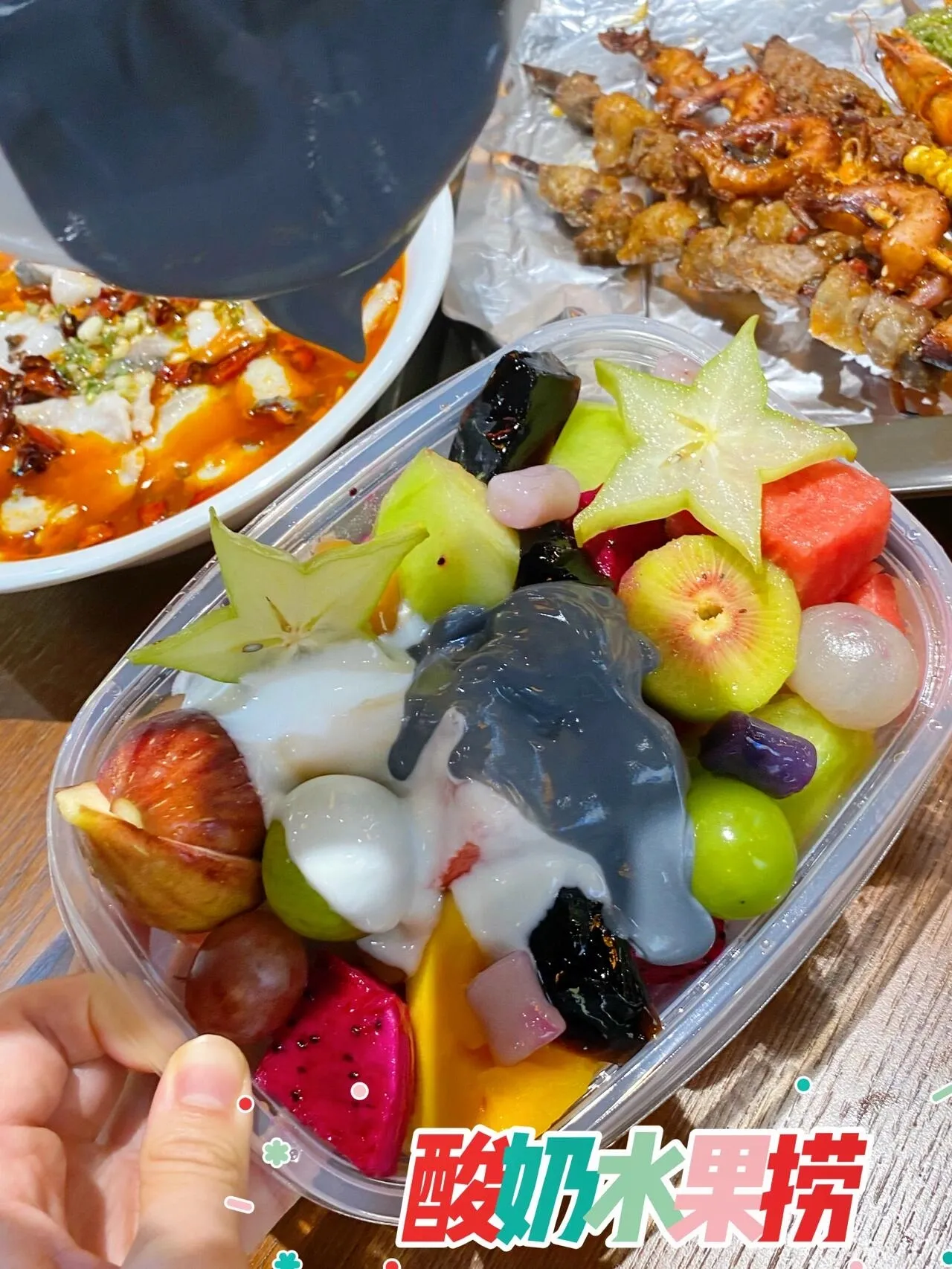 夏天怎么少得了开胃可口的水果捞。这里有很多不常见的水果,如无花果、阳光玫瑰。自制酸奶居然还有水泥灰和炭烧酸奶口味。