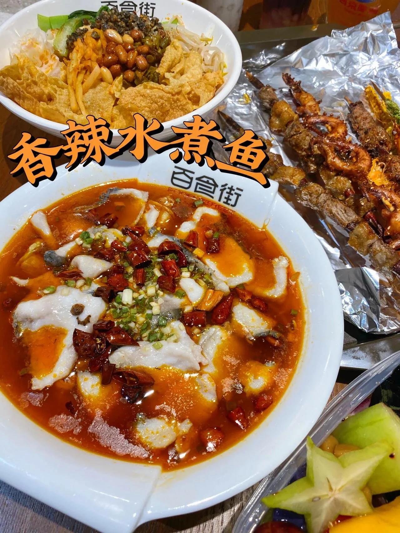 这是北京地区的网红水煮鱼,30多一份。现杀活鱼,我们点的鲈鱼刺很少,肉质很滑嫩,红油也特别入味,特下饭。