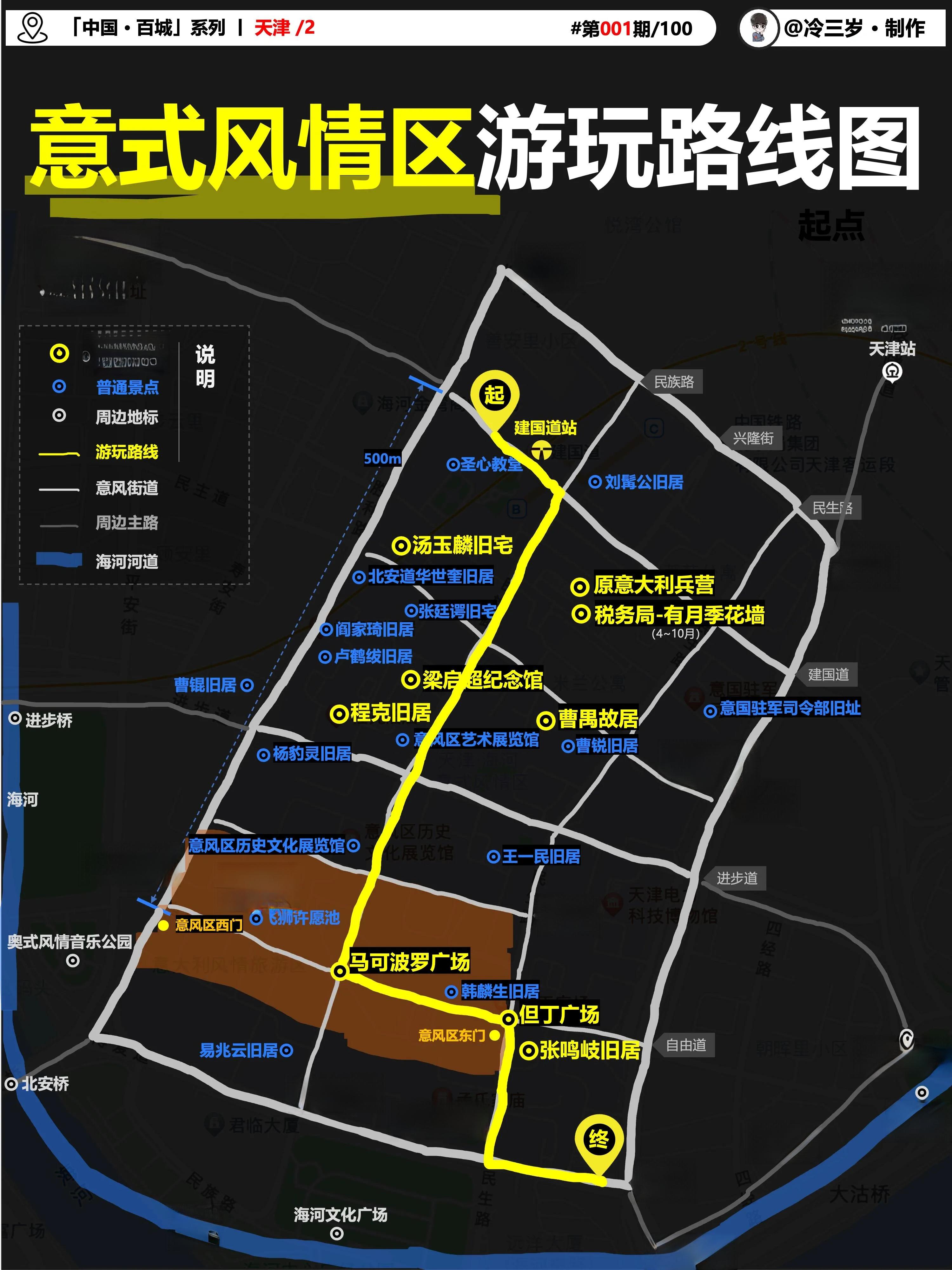 这次攻略主要覆盖红桥、和平、南开、河北区等地区,包含了主路线图、五大道citywalk路线图、意式风情街区路线图以及天津夜景和桥梁介绍。在路线图中,我用黄色标注了强烈推荐的景点,蓝色则是有时间可以去的地方。