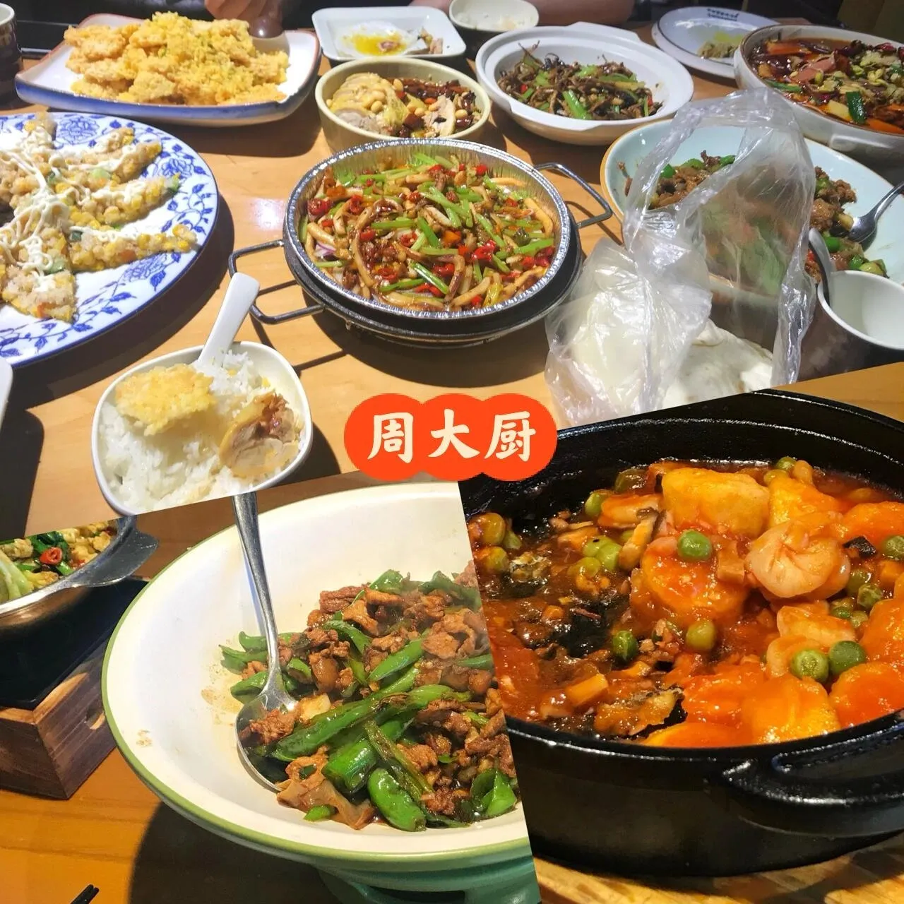辣椒炒肉配上小饼真的太好吃了!他们家的米饭很香,小电饭煲也很可爱。扇贝好吃,基本点什么都不会踩雷。多人聚餐的好选择。不过如果介意油大的话要慎选。另外,不建议去万达那家周大厨,更贵一些,而且炒肉没配小饼,不如巨龙路这家好吃。