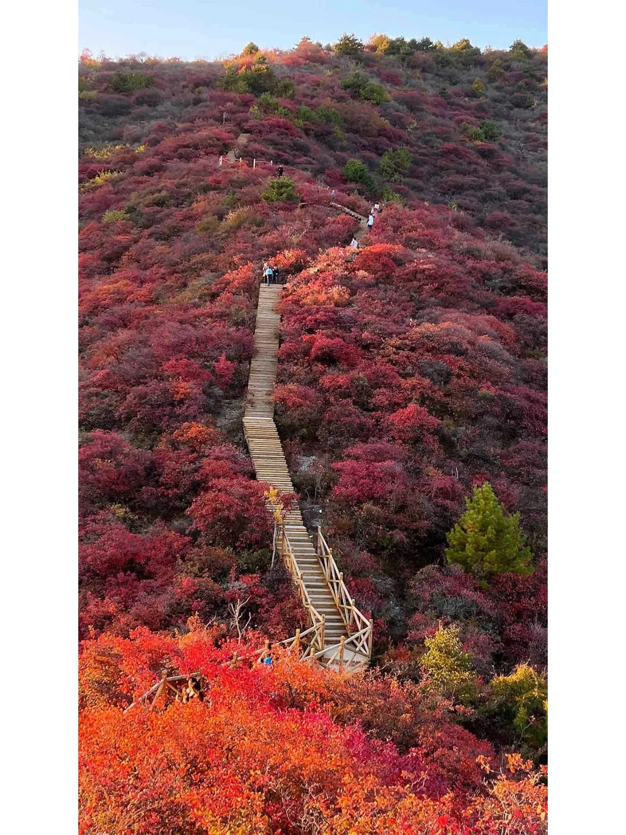 喇叭沟门是北京辖区内唯一的原始森林 ,独特的白桦林在落日中如金子般闪耀,九角枫和映山红则呈现出火红的色彩。 房山木栈道是新开发的景区 ,红叶环绕的山间木栈道成为网红打卡地。