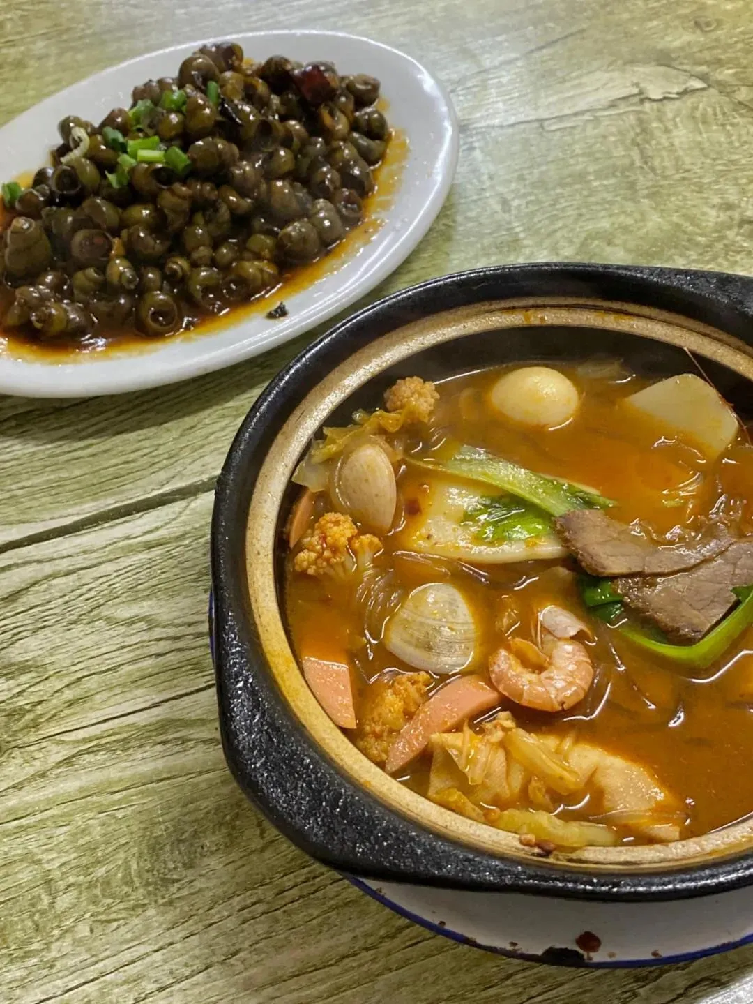 阿达夜宵(蓬园路与蓬莱路交叉口):一份砂锅里有虾、熏鱼、年糕、香肠等丰富食材。
