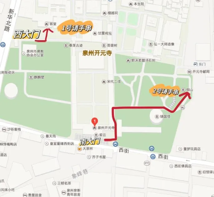 泉州开元寺位于泉州市鲤城区西街176号,是一处不需要预约和购票就能直接进入的古寺庙。对于外地游客来说,从泉州站可以乘坐33路或k602路公交车直达开元寺西门。自驾的朋友可以选择中闽百汇商场停车场或开元盛世广场停车场停车。