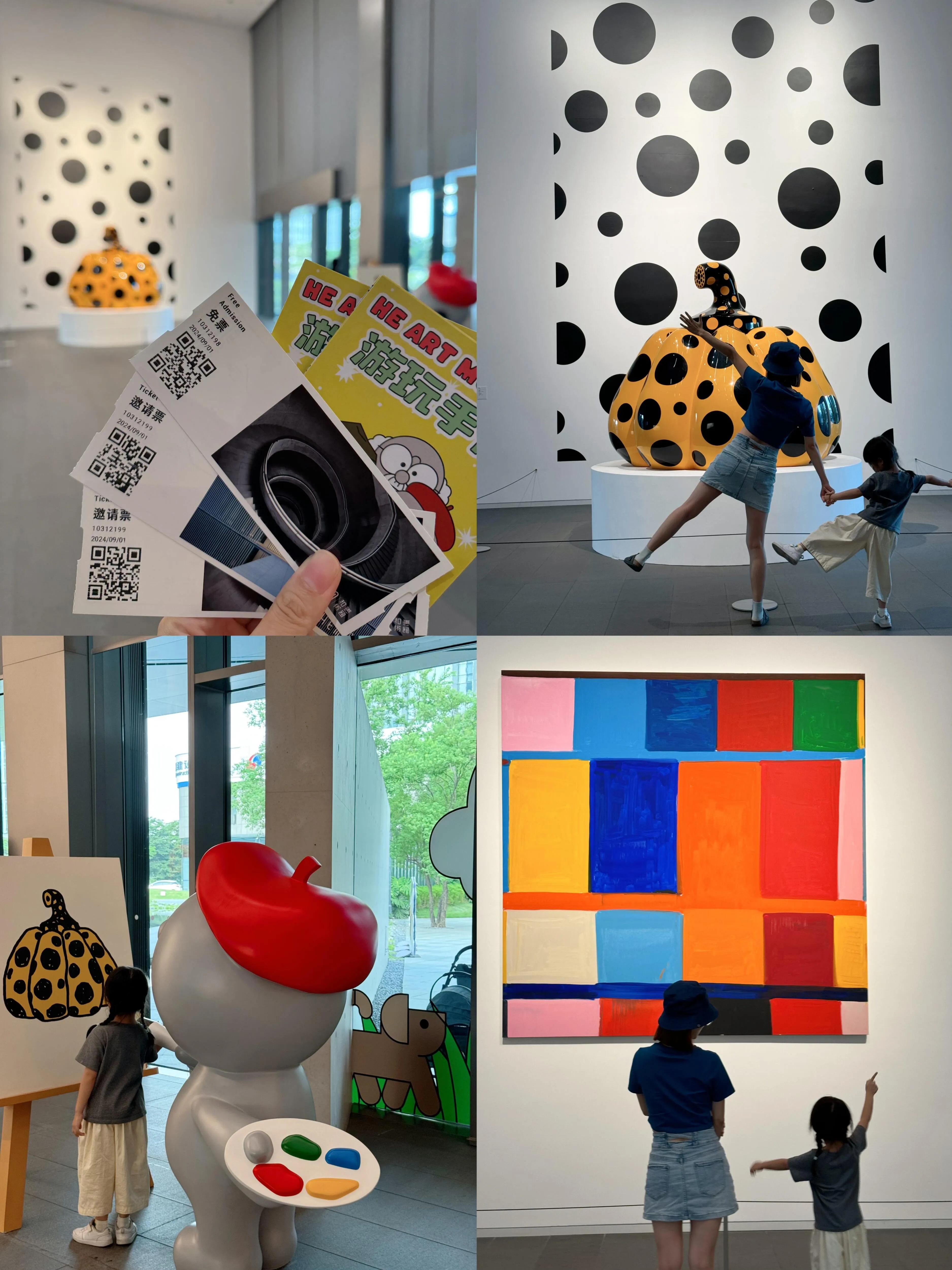 美术馆内有多个适合孩子的活动区域。双螺旋楼梯、草间弥生的南瓜和安藤忠雄的青苹果都是拍照打卡的热门地点。此外,还有流动艺术手工工作坊(需另付费)、和记游乐区(包括画画大赛、夹娃娃机和磁吸装扮游戏),以及和记士多,后者提供展览相关的原创设计周边、精选绘本和文具。