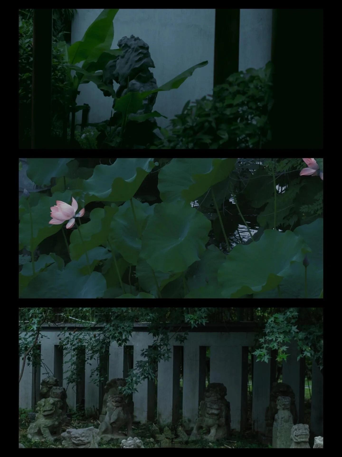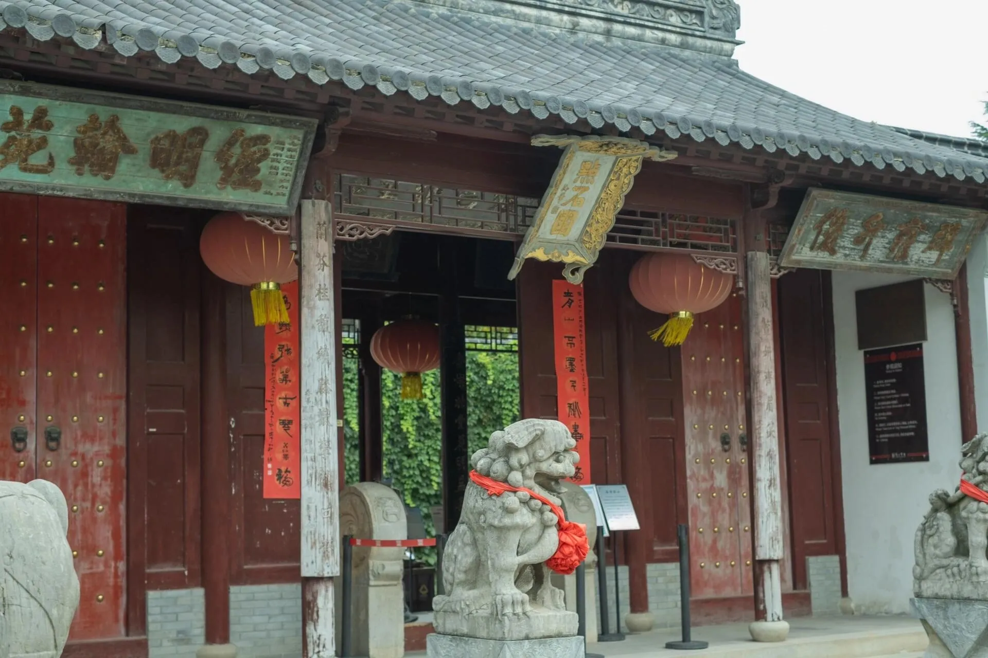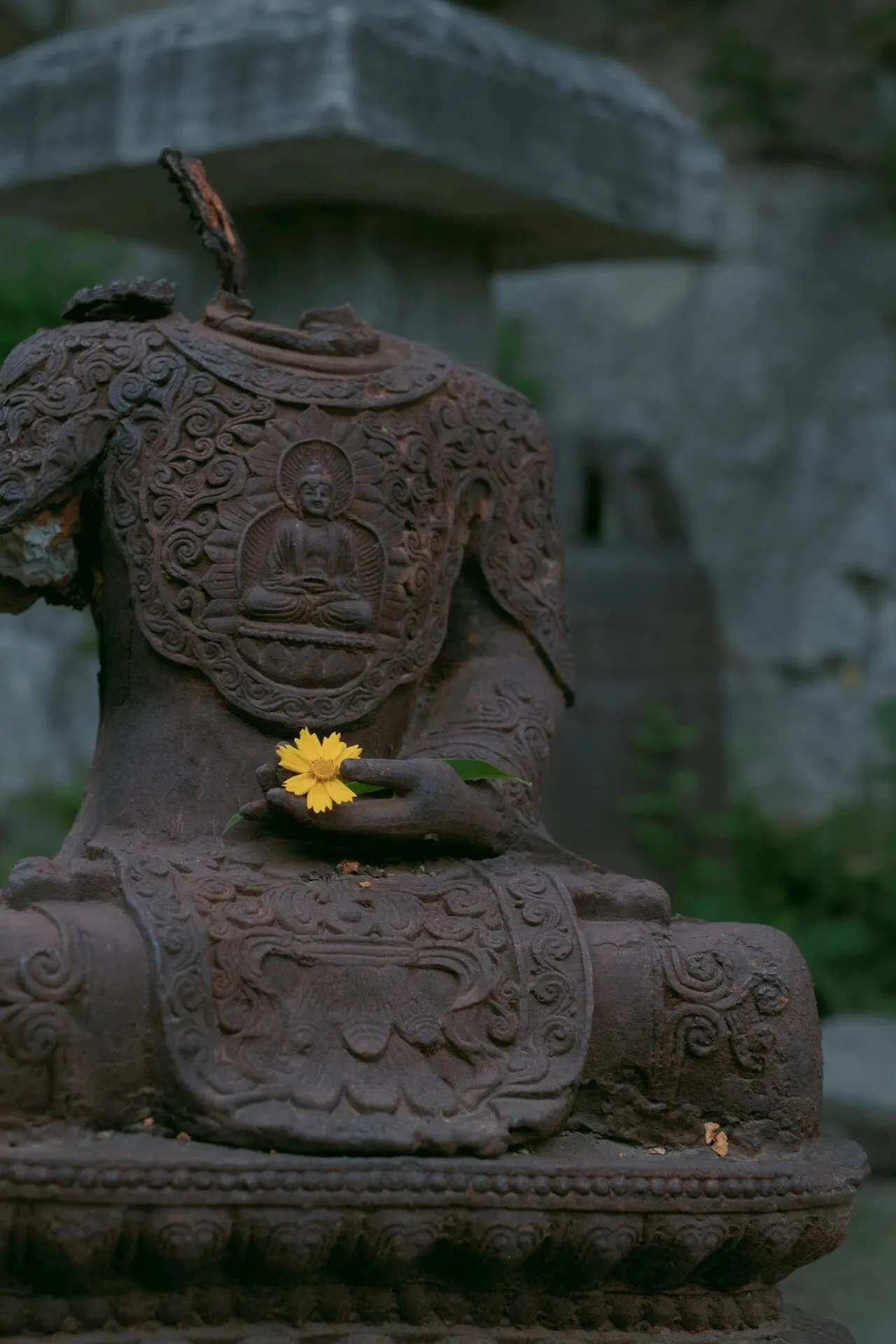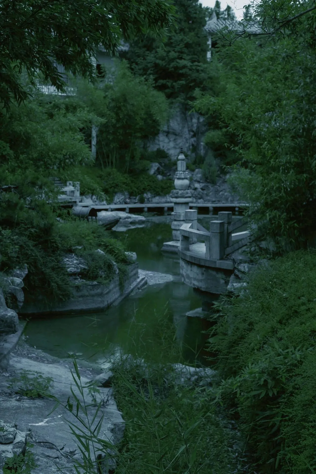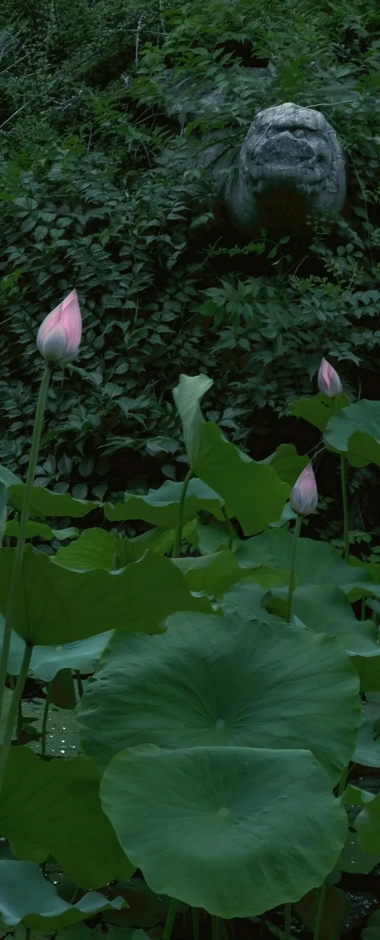 漫步林中,耳畔萦绕着悠扬的钟声,仿佛承载着人们最真挚的祈愿。小桥流水间,亭亭玉立的荷花在风中轻轻摇曳。树荫下镂空的院墙边,一群小石狮静静地“开着会”,为这静谧的林间增添了几分趣味。