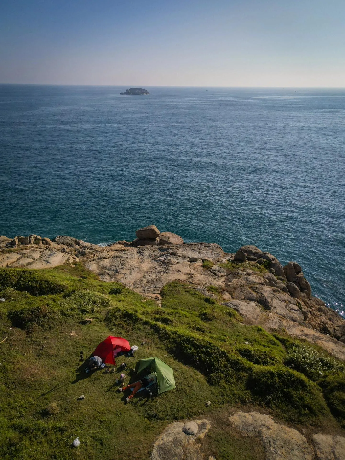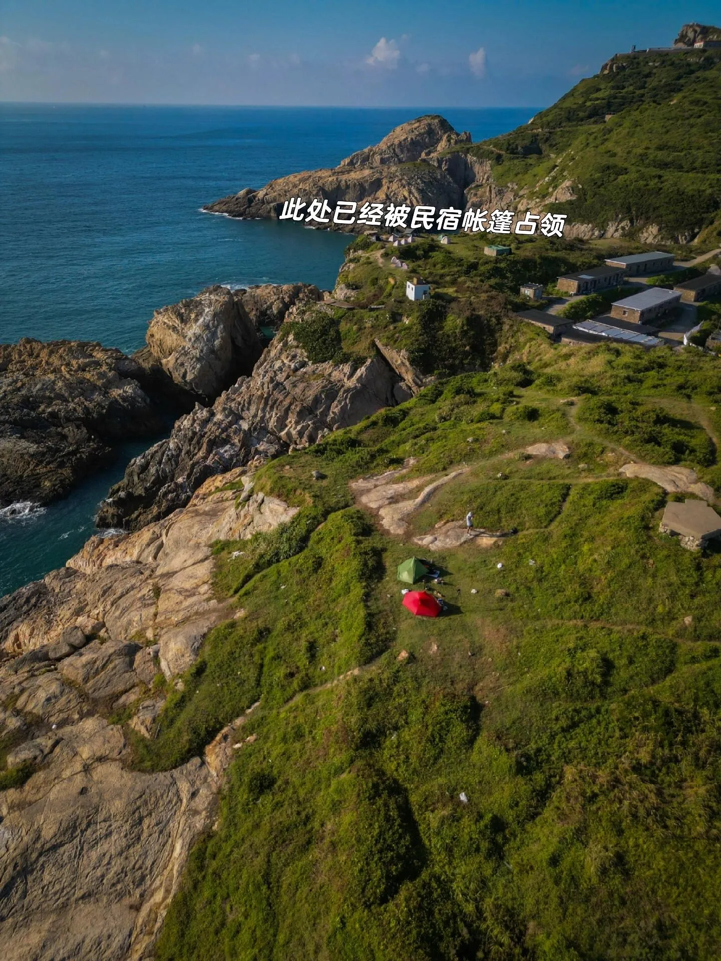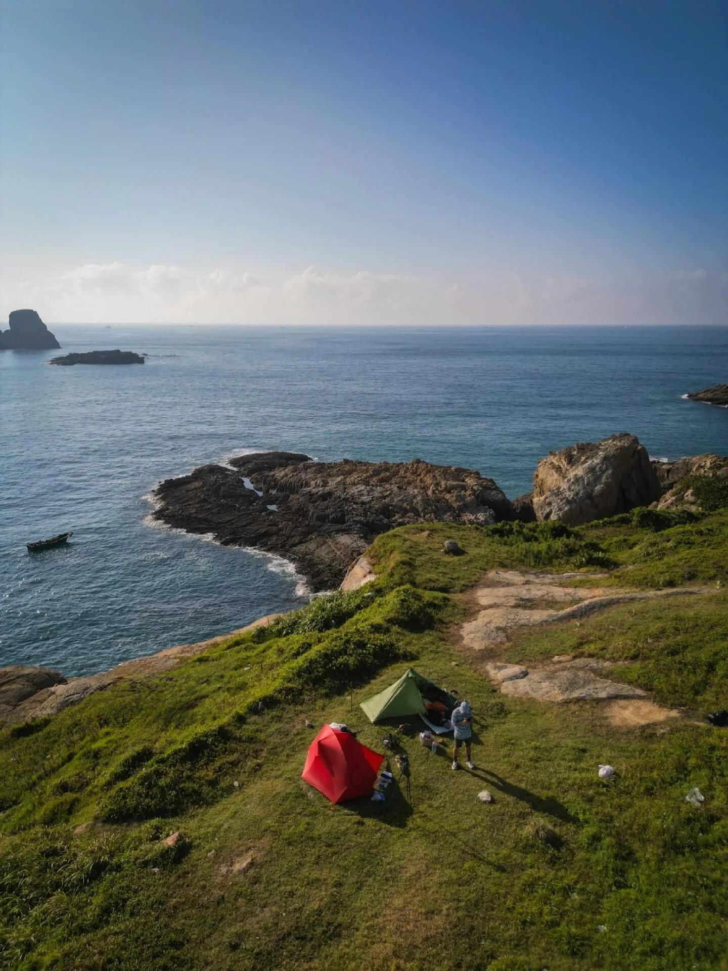 渔山岛的风景确实名不虚传 。 蓝得透亮的海水中还透着些许翠绿 ,一看就知道是未受污染的净土。拍照效果自然是一流的。不过近期的露营体验并不算太好,主要是因为天气潮湿闷热,即便有海风也难以缓解。也许九月天气会凉爽些,但那时可能就没机会来了。