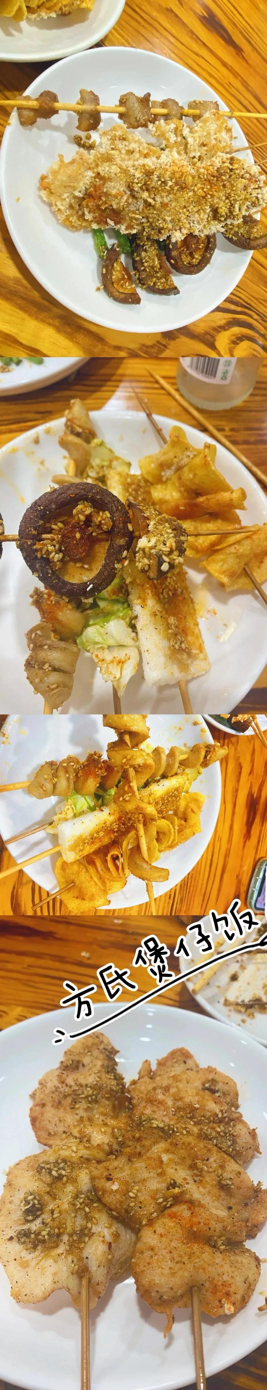方式煲仔饭:这家店以炸串为主,晚上营业。味道确实不错,两人消费约50元。距离仓直桥大约一公里。