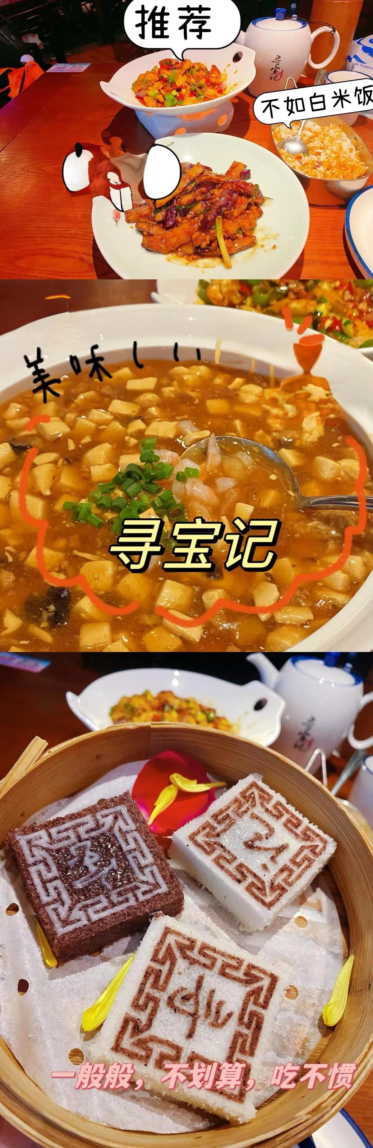 寻宝记(鲁迅故里店):这里的豆腐西施清爽可口,很好地中和了其他菜品的油腻感。鸡蛋炒大肠初尝不错,但可能会有些腻。酱茄子值得一试,即使不喜欢茄子的人也可能会喜欢。两人餐费126元。