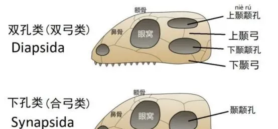 合弓纲动物具有一个颞孔,而蜥形纲具有两个颞孔或无孔。