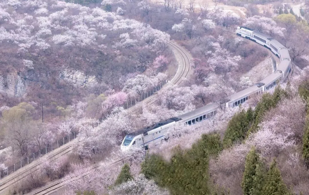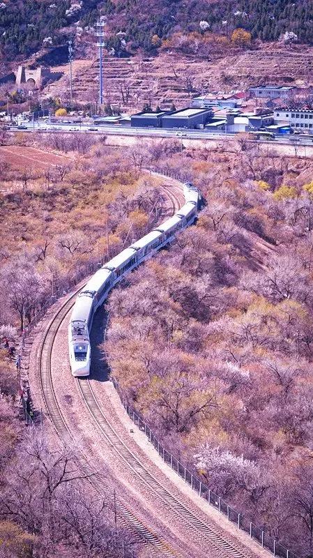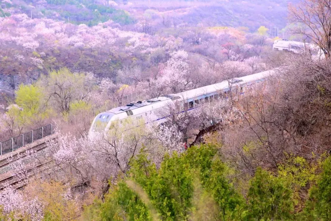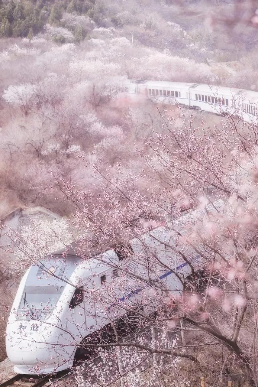 列车从陡峭的燕山山脉之间出发,一个转弯,成片的山桃花便跃入眼帘。