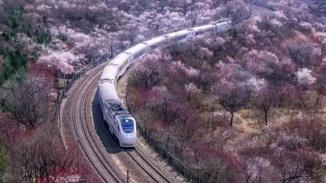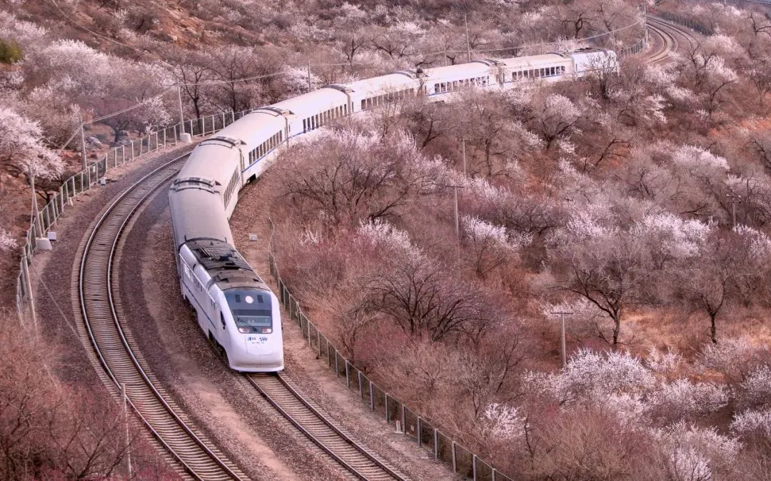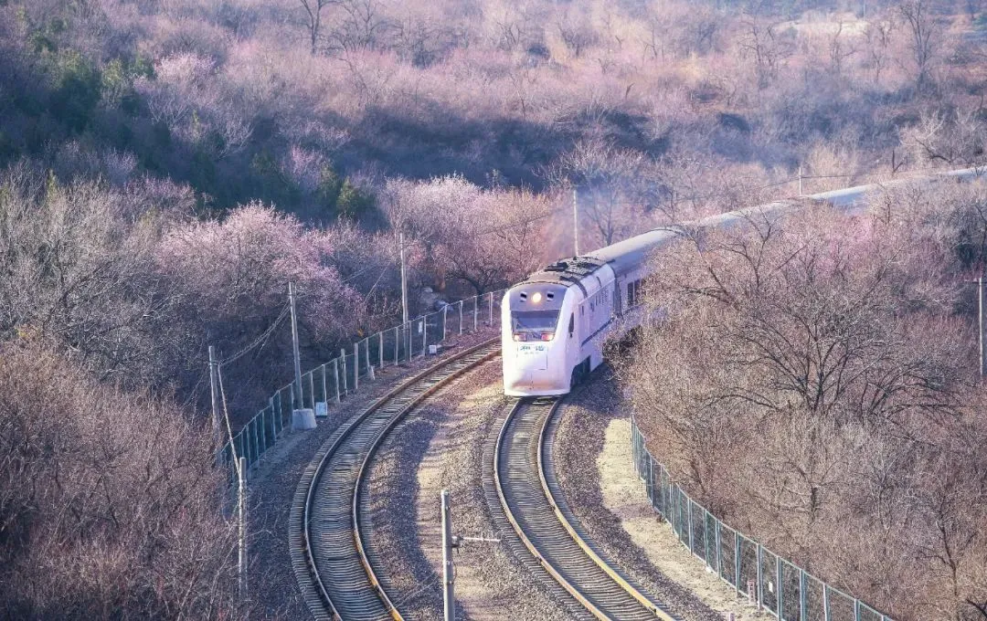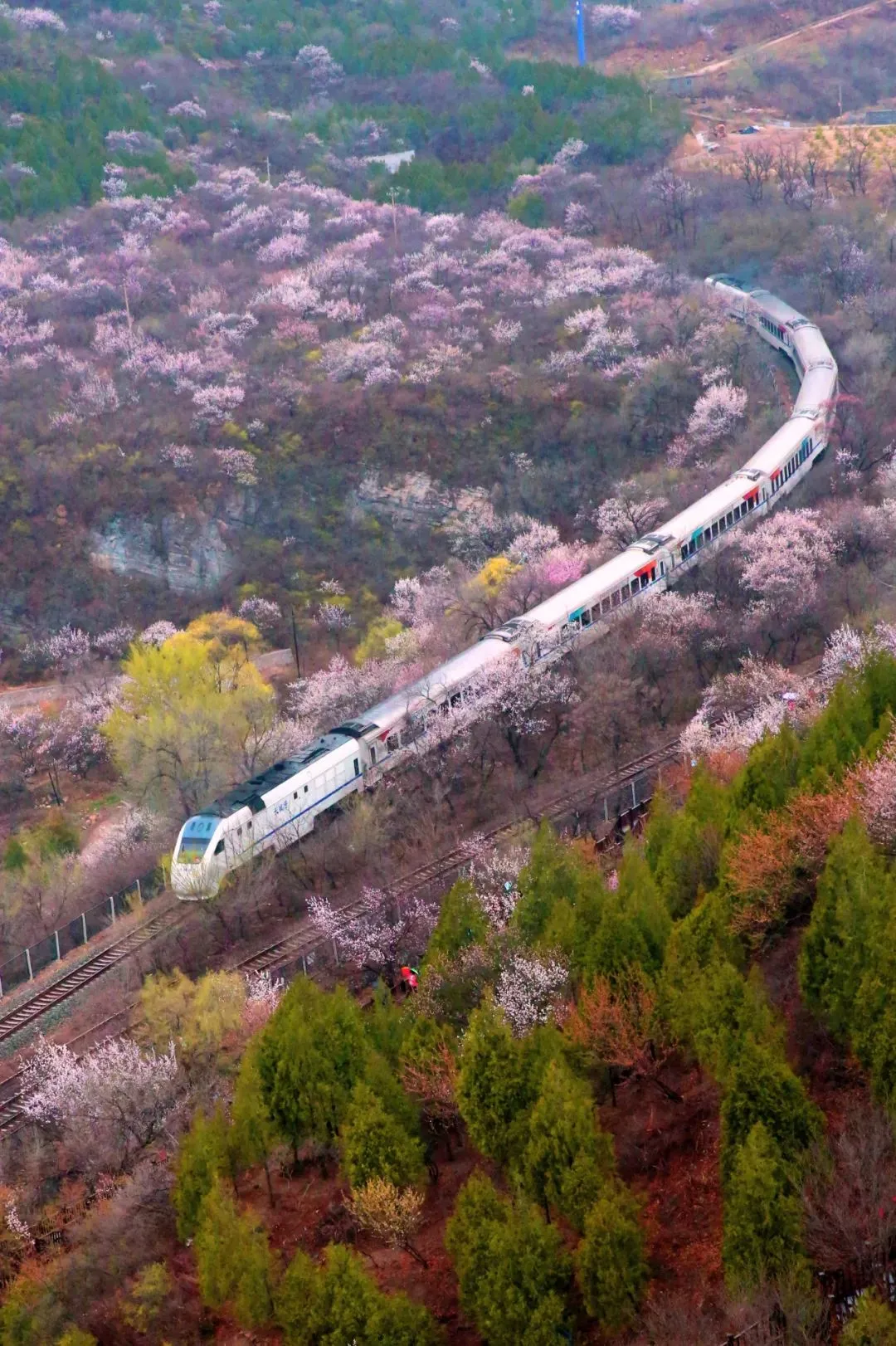 列车从陡峭的燕山山脉之间出发,一个转弯,成片的山桃花便跃入眼帘。