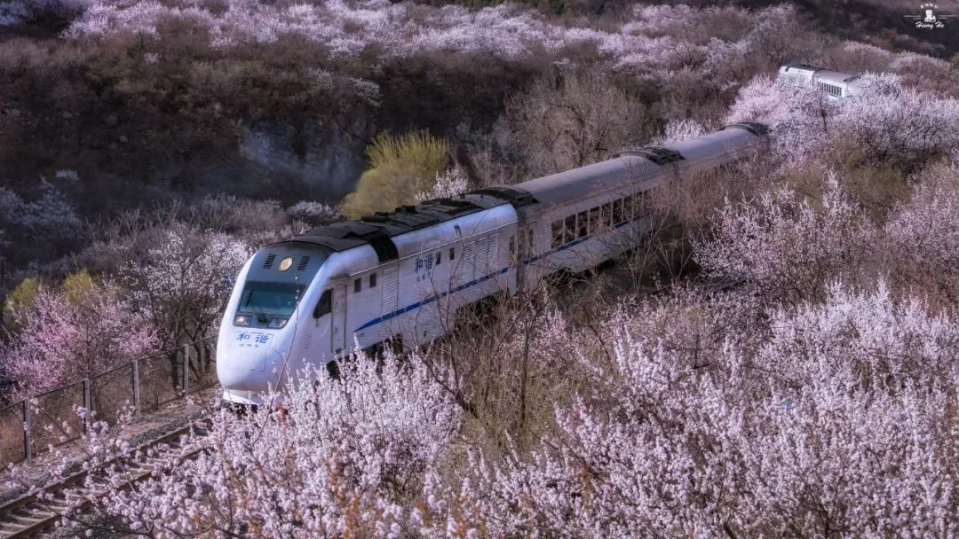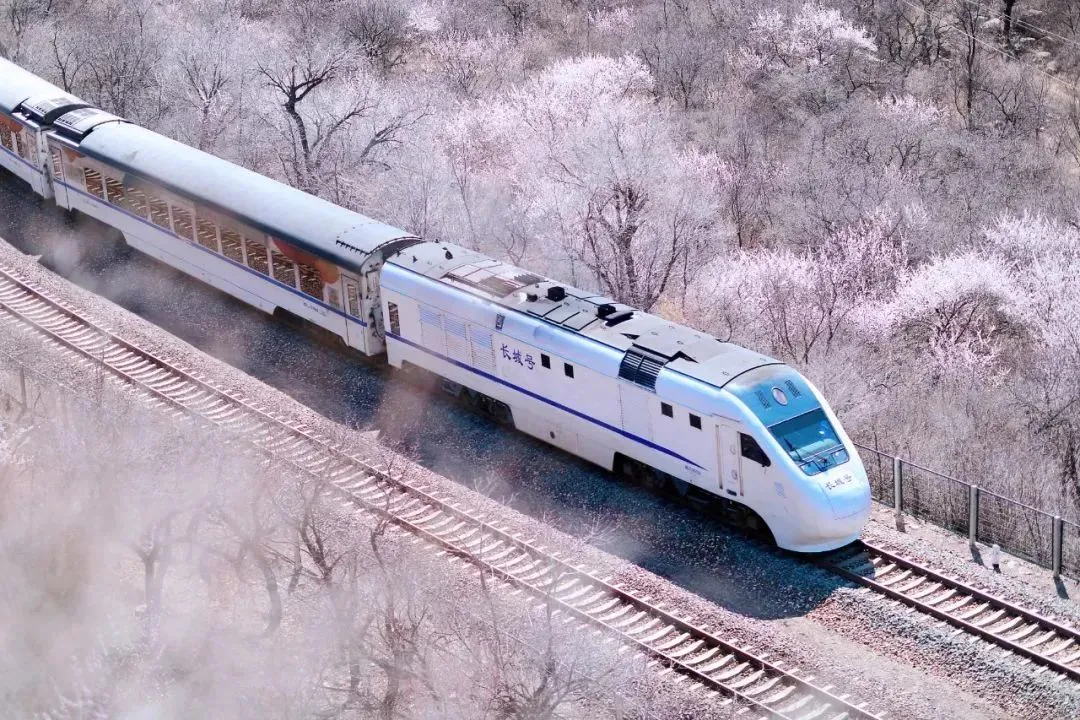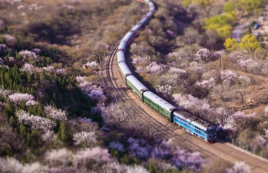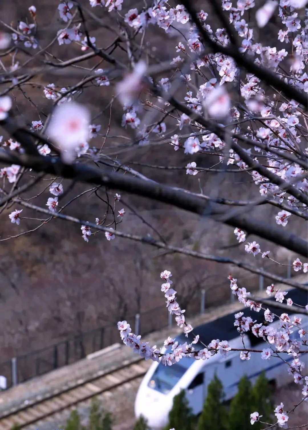 当寒冰融化之际,这里便呈现出繁花似锦的景象,浅色的杏花和淡粉的山桃花依次开放,与白色的列车相互辉映,组成春天里最亮丽的一道风景线。