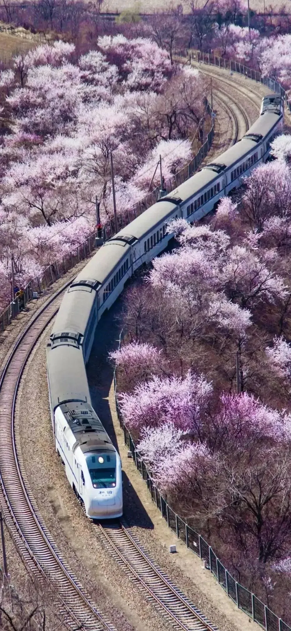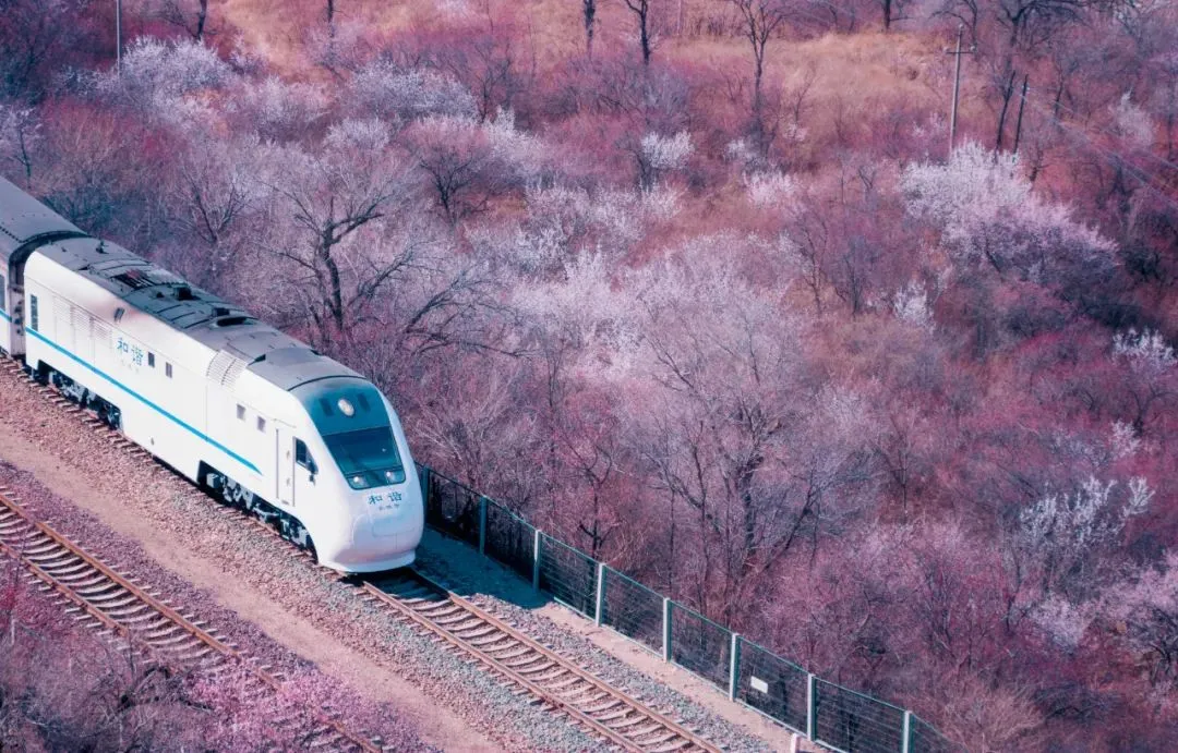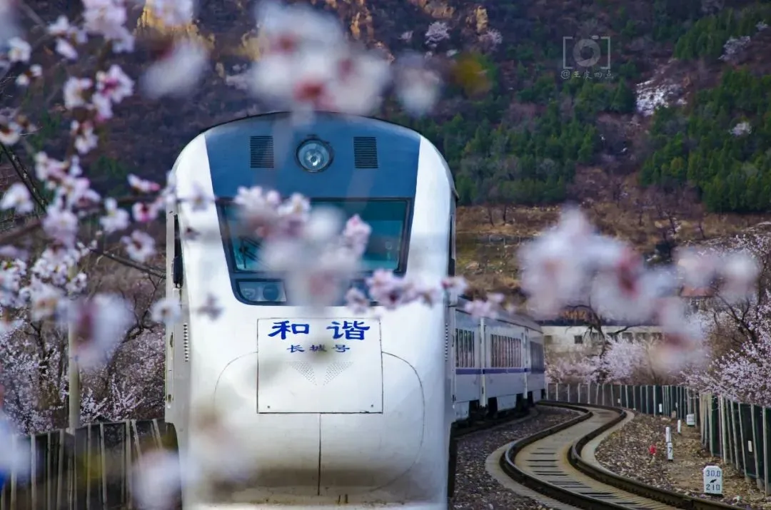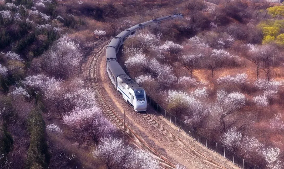 当寒冰融化之际,这里便呈现出繁花似锦的景象,浅色的杏花和淡粉的山桃花依次开放,与白色的列车相互辉映,组成春天里最亮丽的一道风景线。