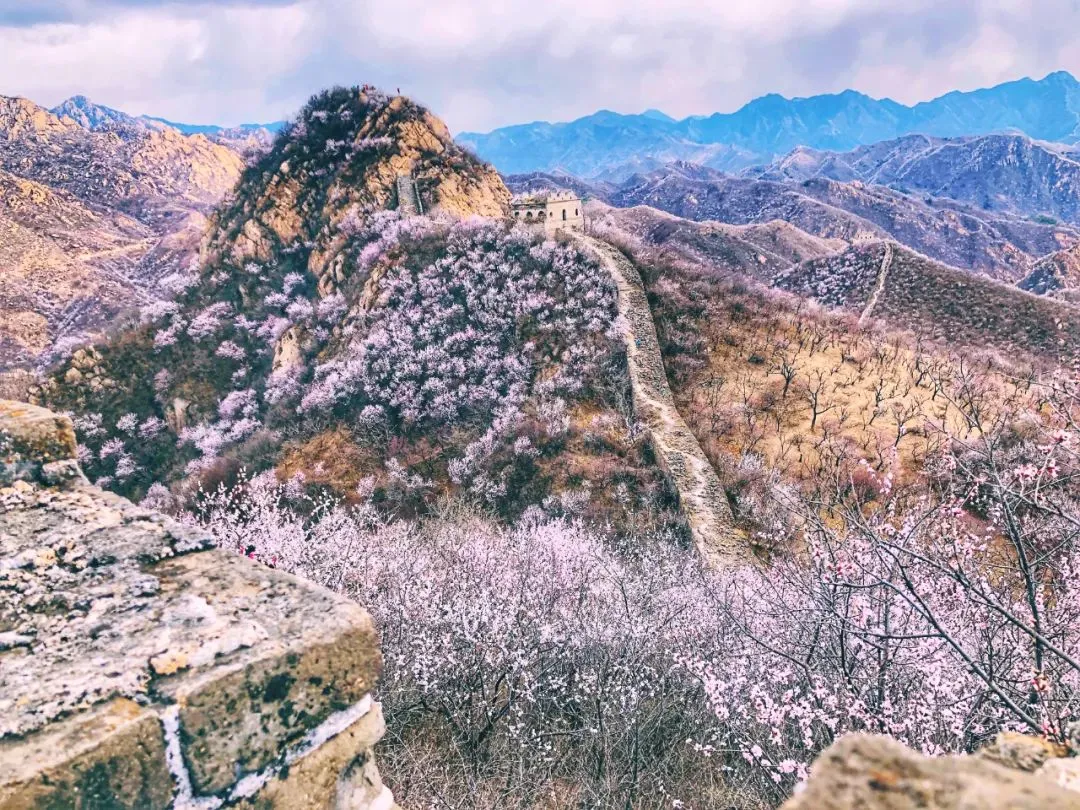 沿途的八达岭长城、烽火台和满山的桃花一览无余。