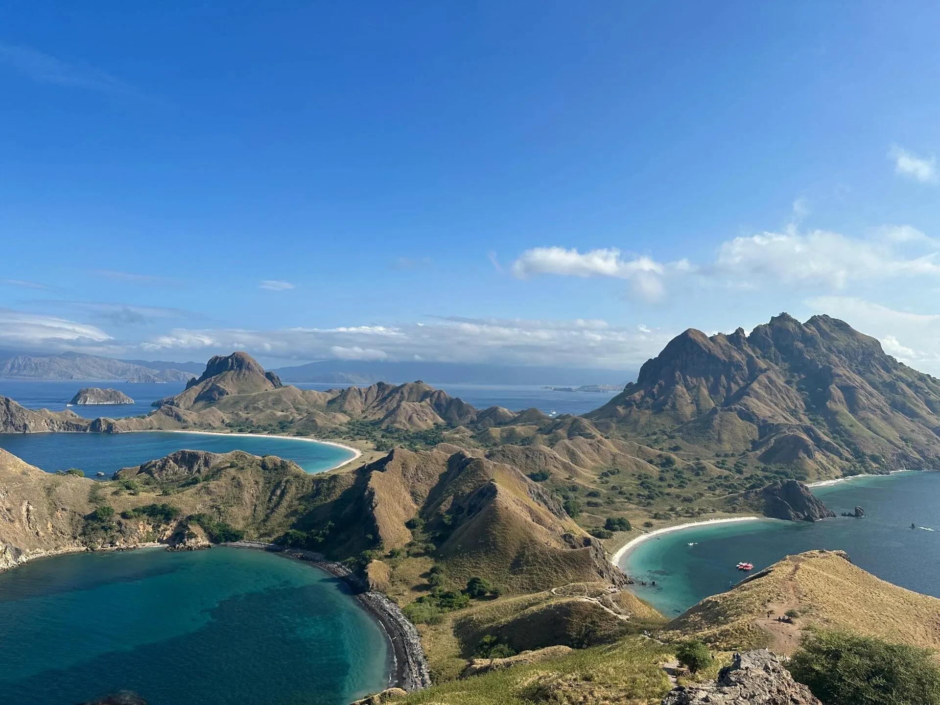 PADAR岛:船程约1小时。这是一个拥有四个海湾的绝美小岛。登山途中可欣赏海水颜色变换,周边小岛逐渐浮现。山顶是著名拍照点,可拍摄三湾同框的壮观景象。