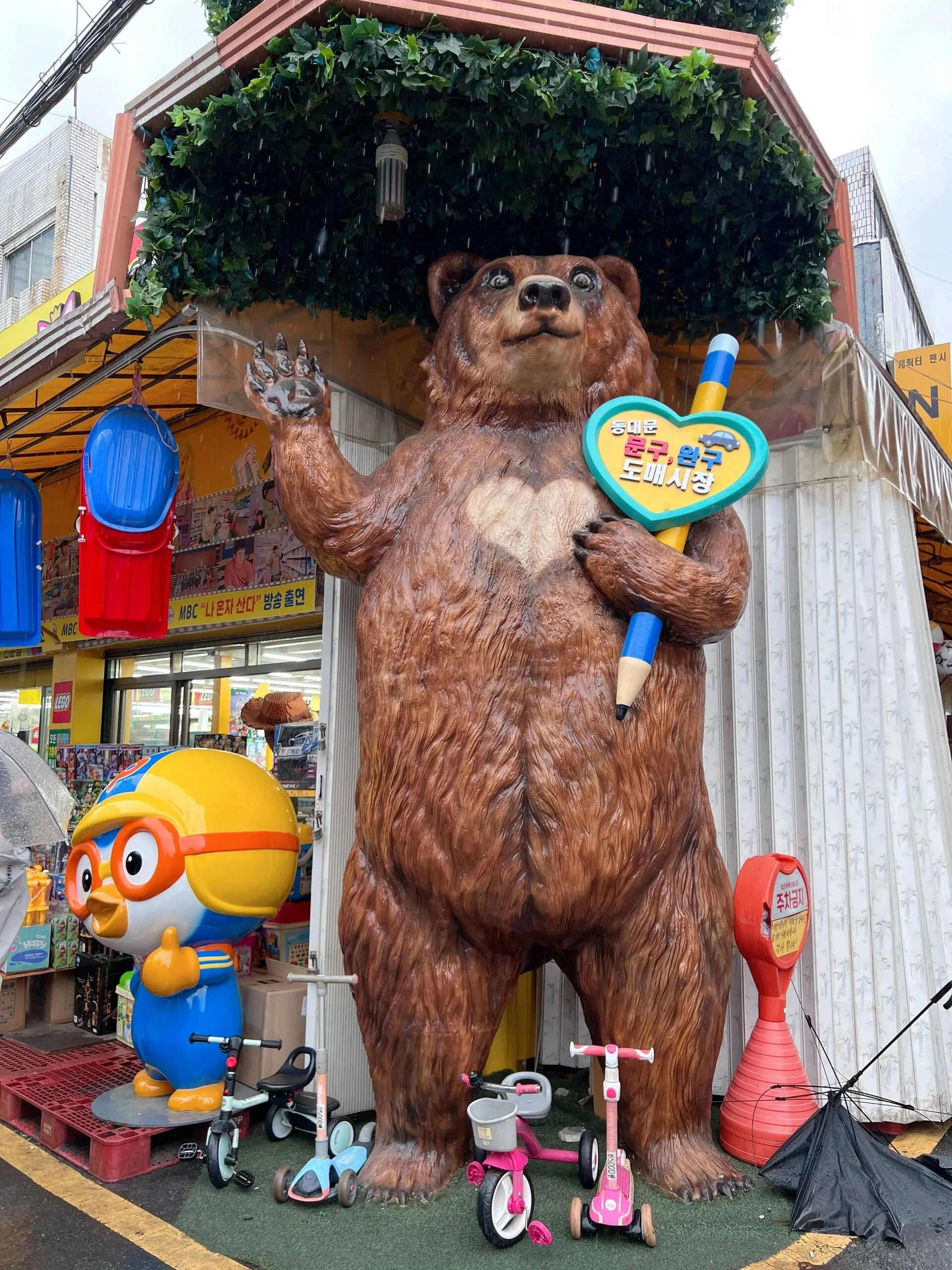 这里是一整条专门售卖文具和玩具的街道,汇集了数十家各式各样的店铺。其中最受欢迎的是“승진완구”,店铺门口有一个巨大的熊玩偶,屋顶上还有一个醒目的大猩猩,非常容易找到。这家店几乎囊括了市面上所有种类的玩具,而且价格比其他地方稍微便宜一些。