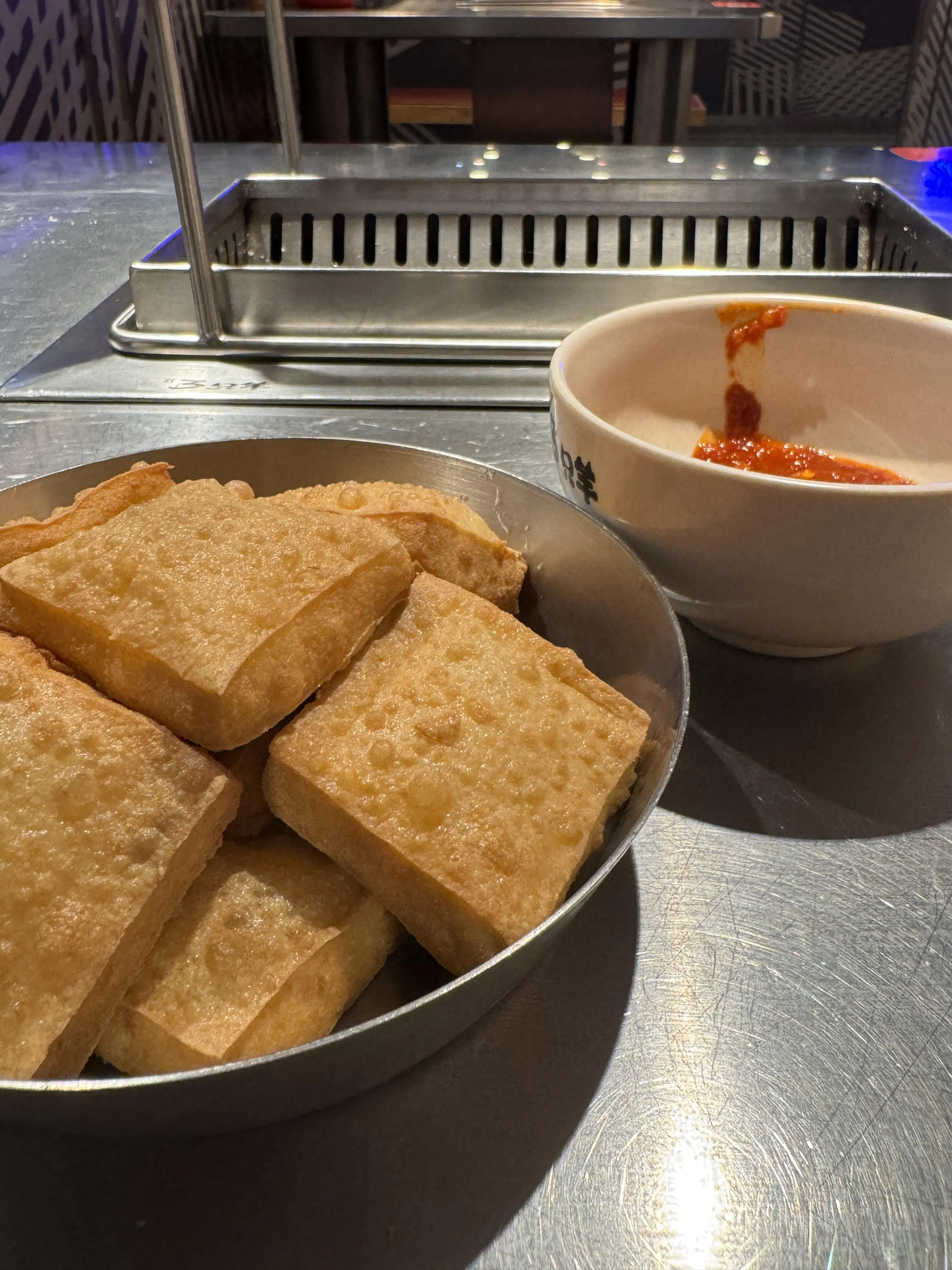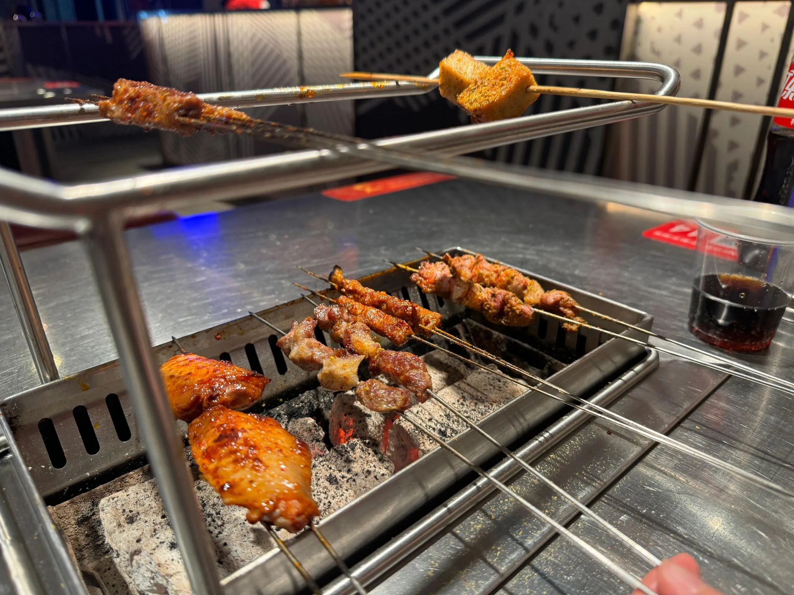 三只羊烧烤环境优雅,提供免费柠檬水。烤串采用半熟方式,需要自己烤熟后食用。可以一边烤一边调味,实现个性化的DIY体验。炸干子口感佳,搭配的酱料略咸,个人建议蘸醋食用更佳。这里独特的醋味烧烤,使用特调微甜醋料,是一种新颖的烧烤体验。