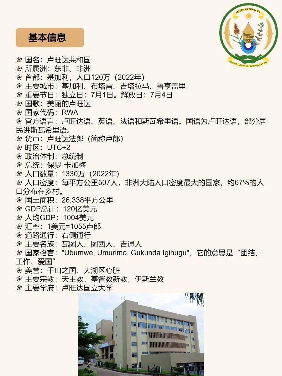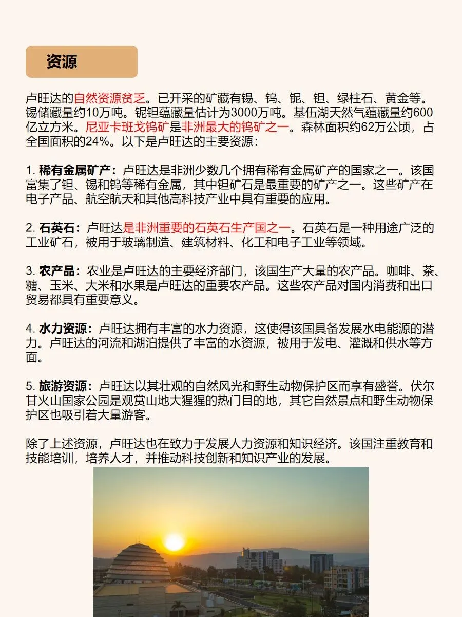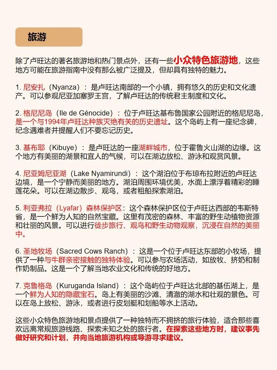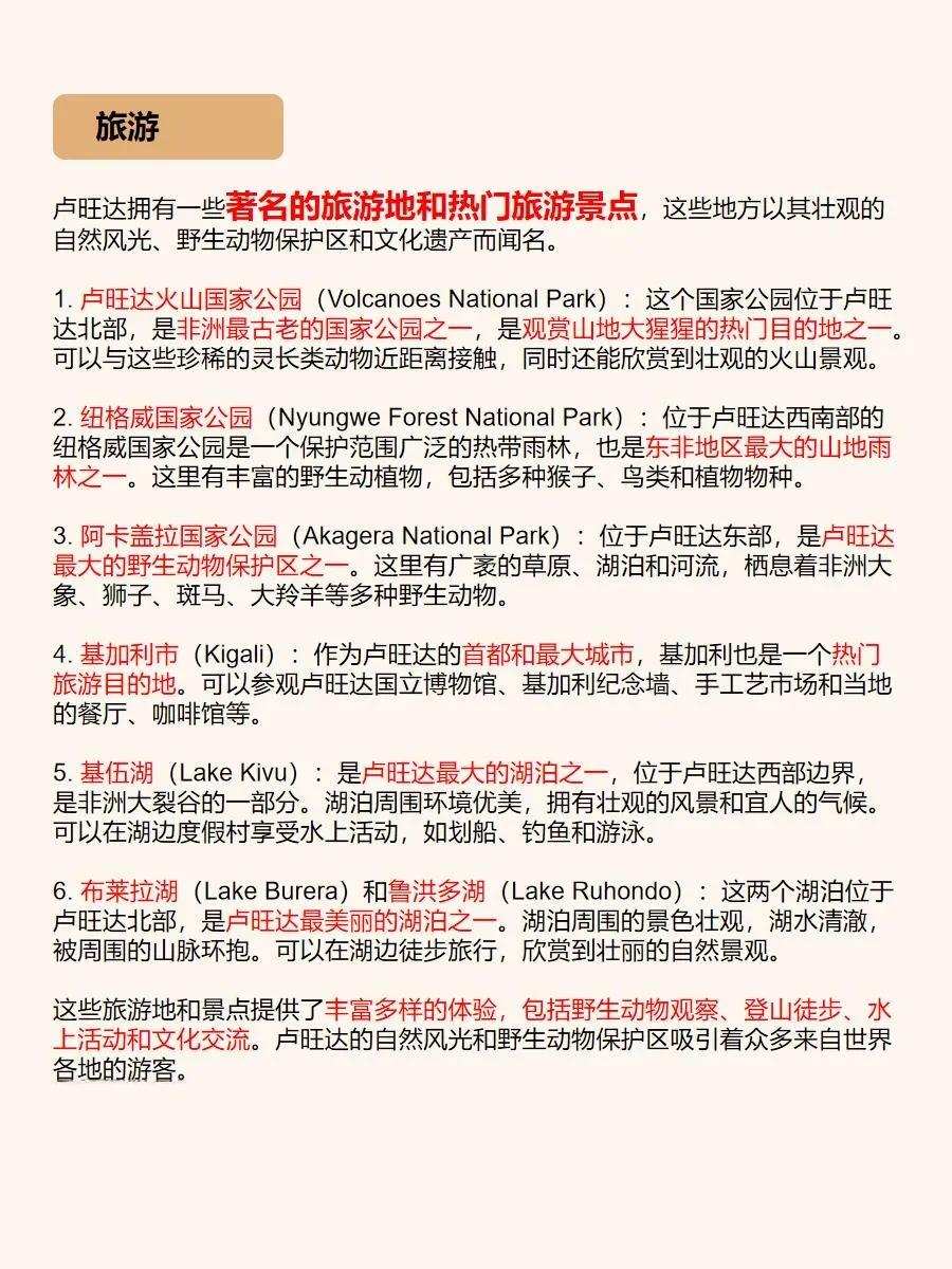 总之,卢旺达是一个令人陶醉的旅游胜地,它拥有壮丽的自然景观、丰富的野生动植物和深厚的历史文化底蕴。如果你想追寻非洲的神秘,与大自然亲密接触,卢旺达绝对是一个值得一游的目的地!