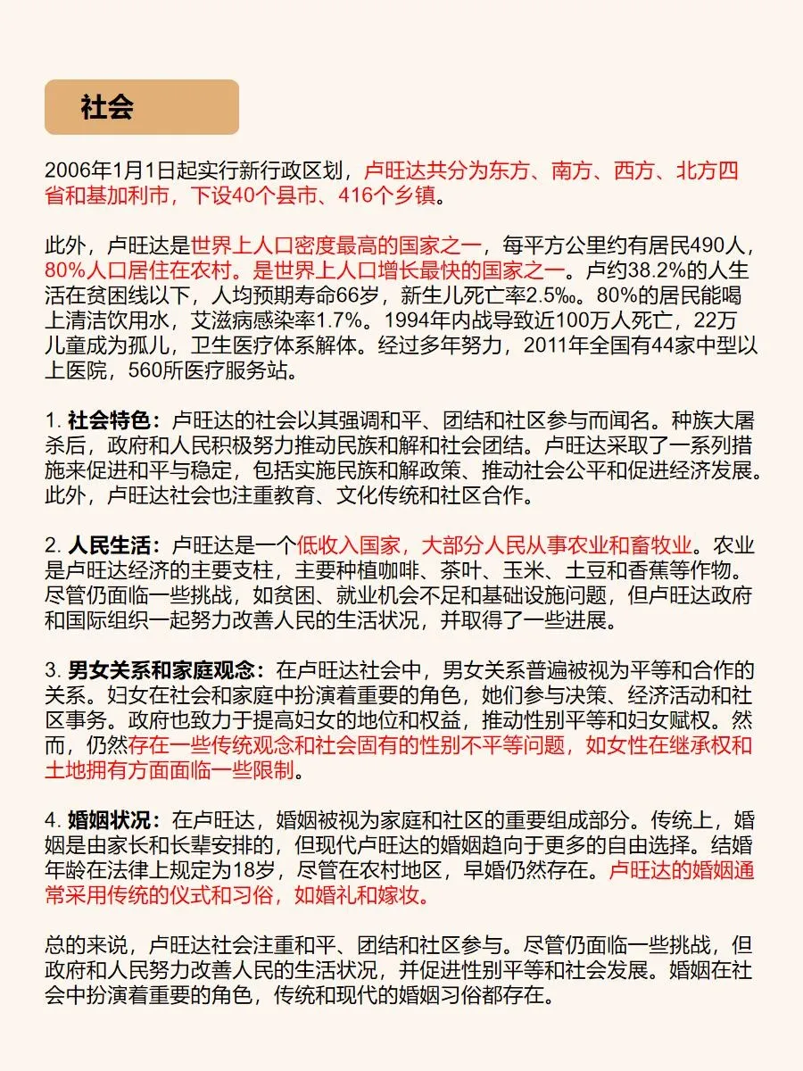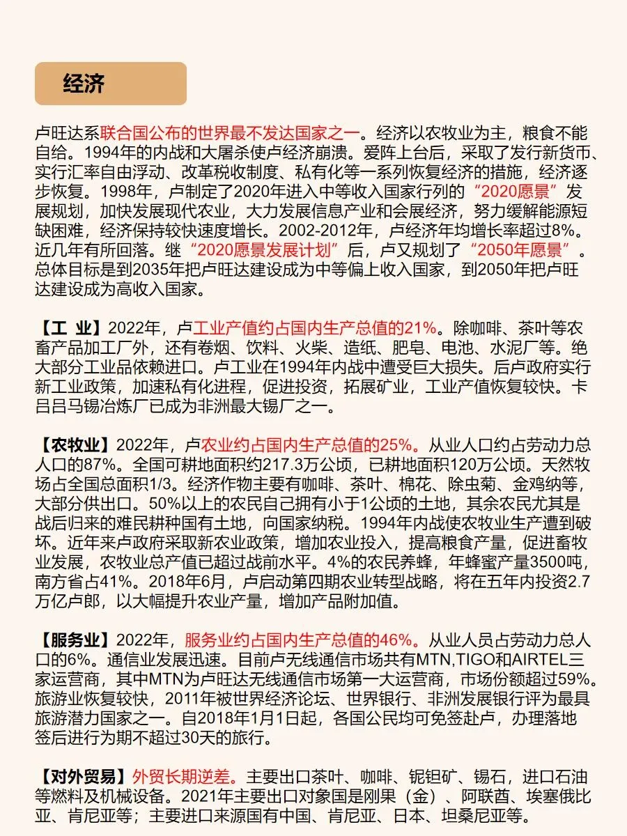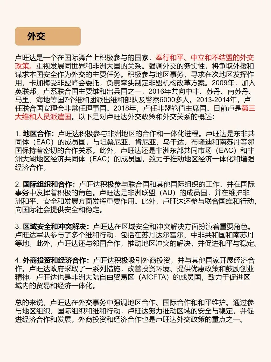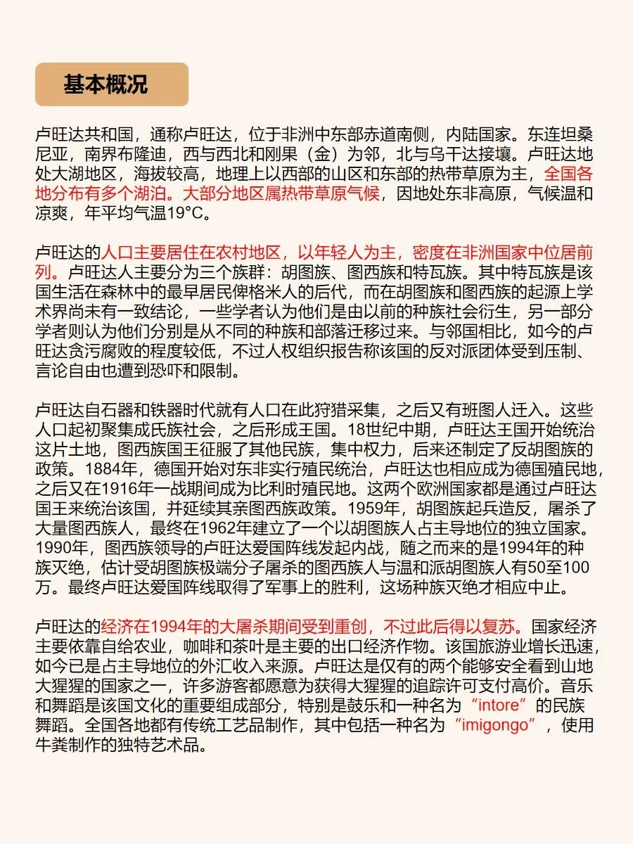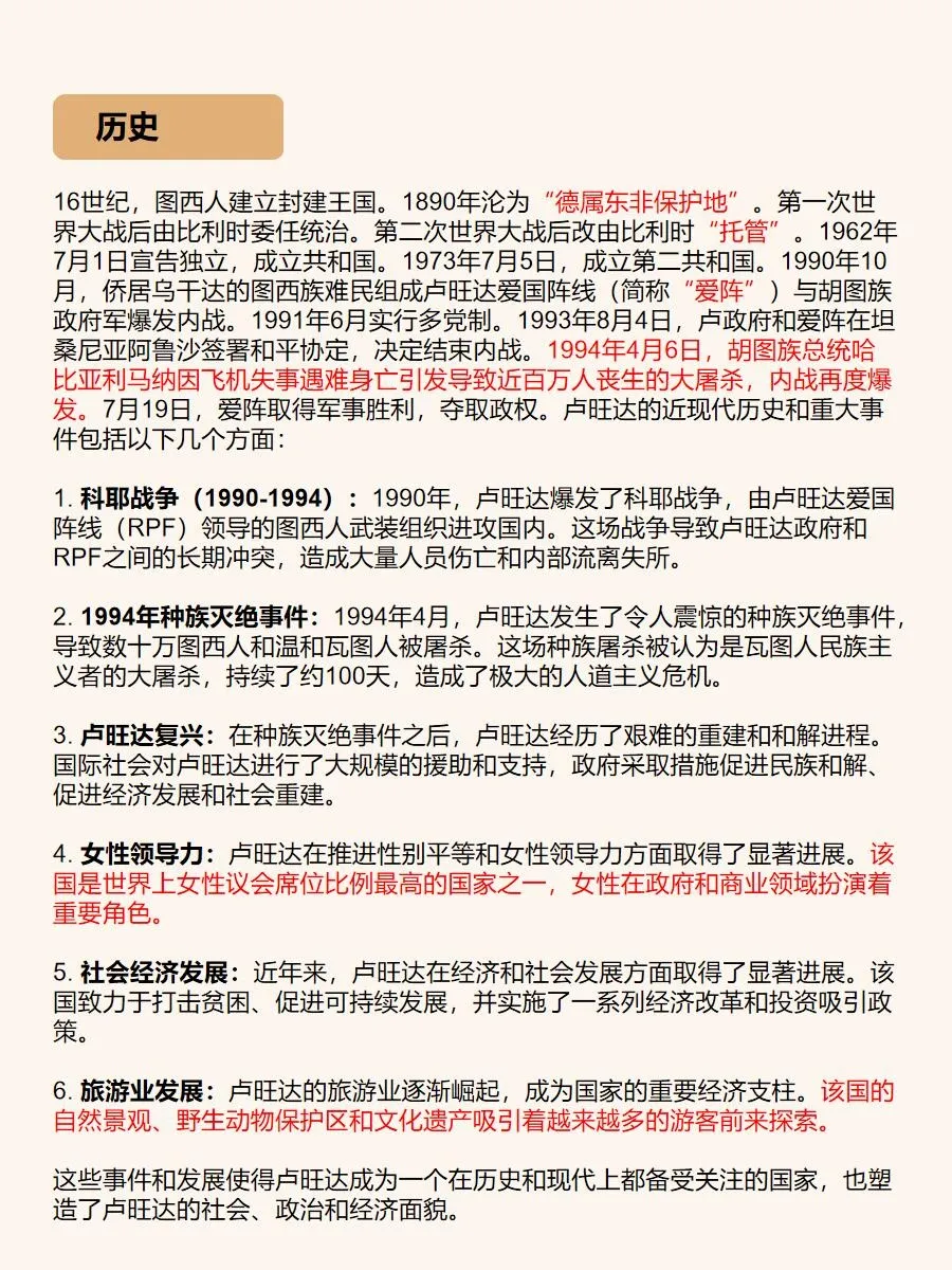 总之,卢旺达是一个令人陶醉的旅游胜地,它拥有壮丽的自然景观、丰富的野生动植物和深厚的历史文化底蕴。如果你想追寻非洲的神秘,与大自然亲密接触,卢旺达绝对是一个值得一游的目的地!