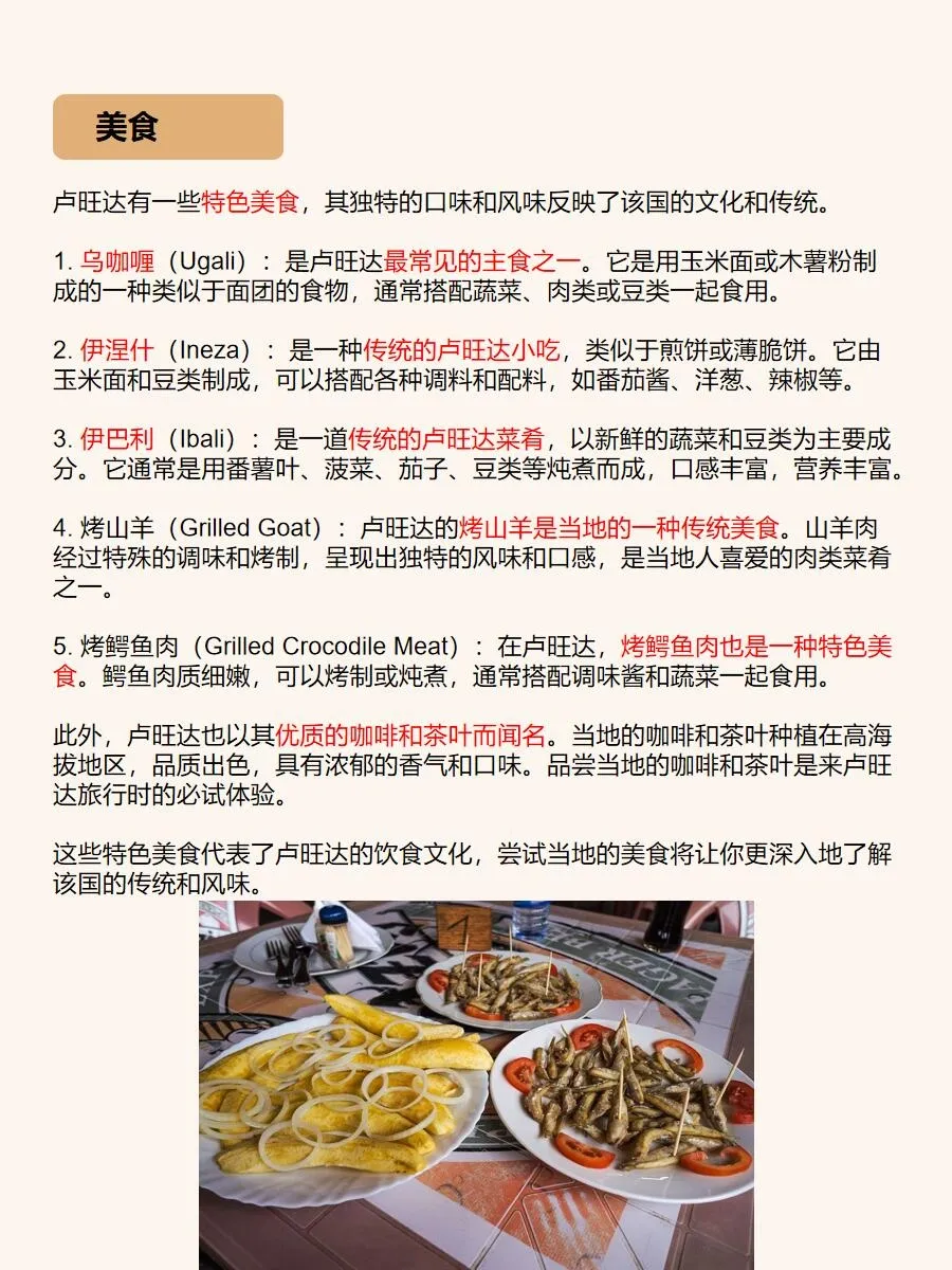 卢旺达不仅有美丽的自然风光,还有着悠久的历史和丰富的文化特色。在首都基加利,你可以参观卢旺达国立博物馆,了解这个国家的历史和文化传统。卢旺达人民的热情好客会让你感受到非洲的魅力和温暖,你可以与当地人交流,品尝正宗的卢旺达美食,感受他们的生活方式和传统艺术。