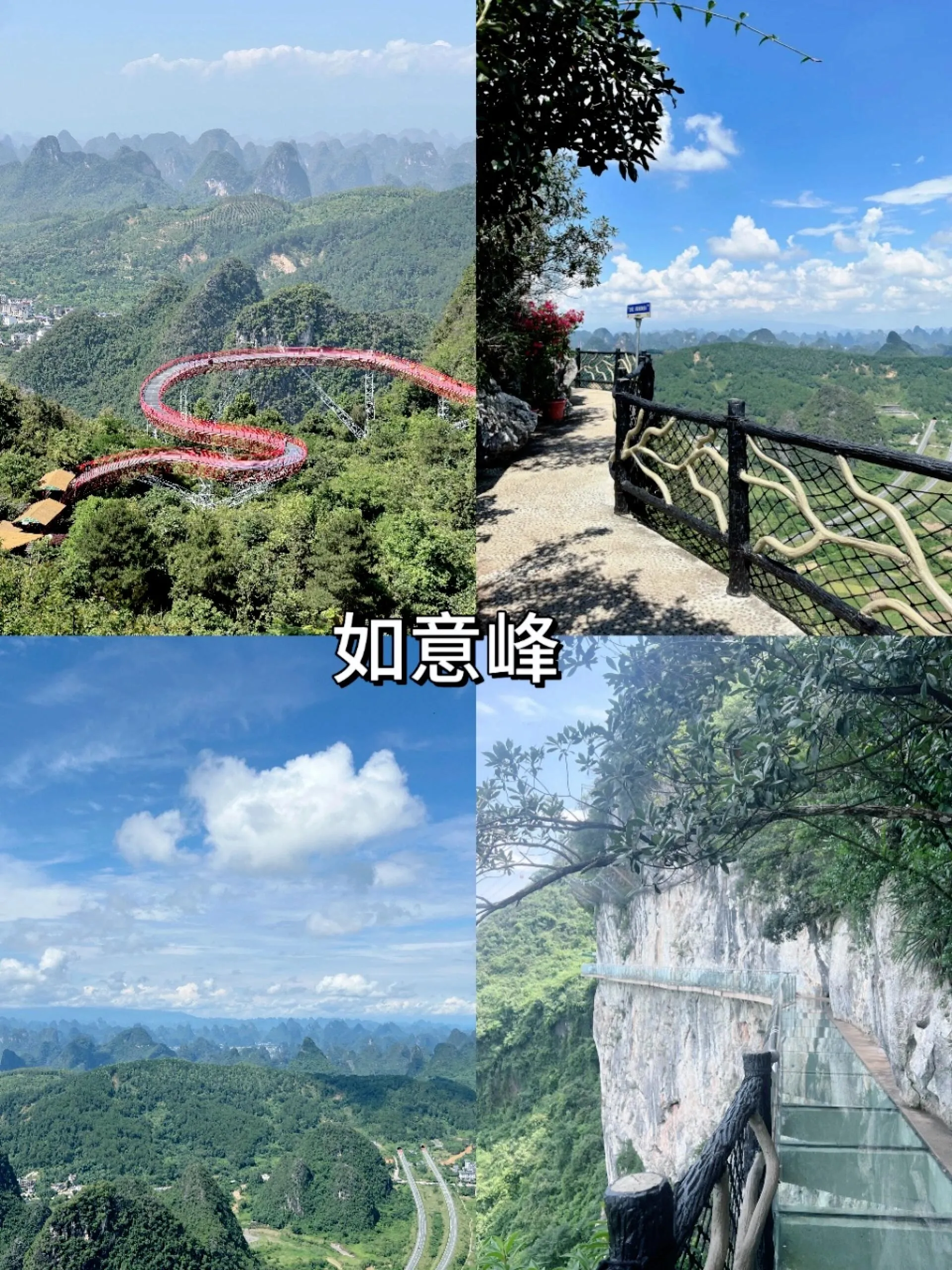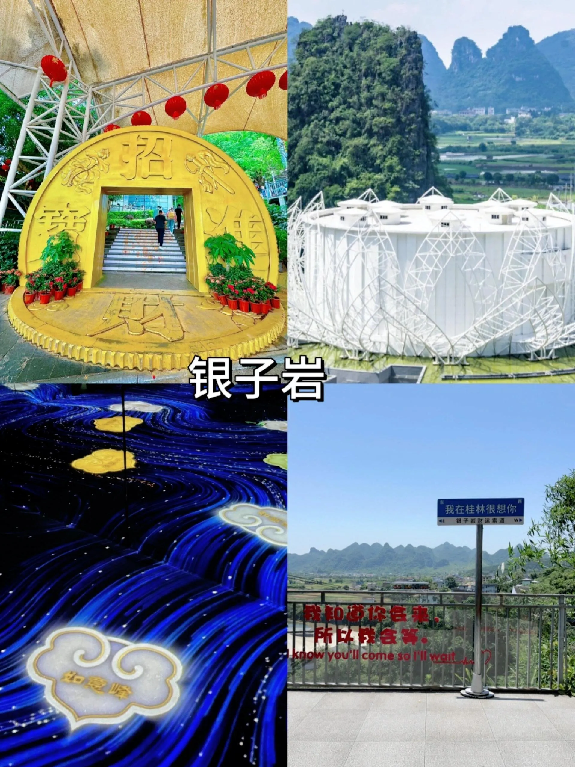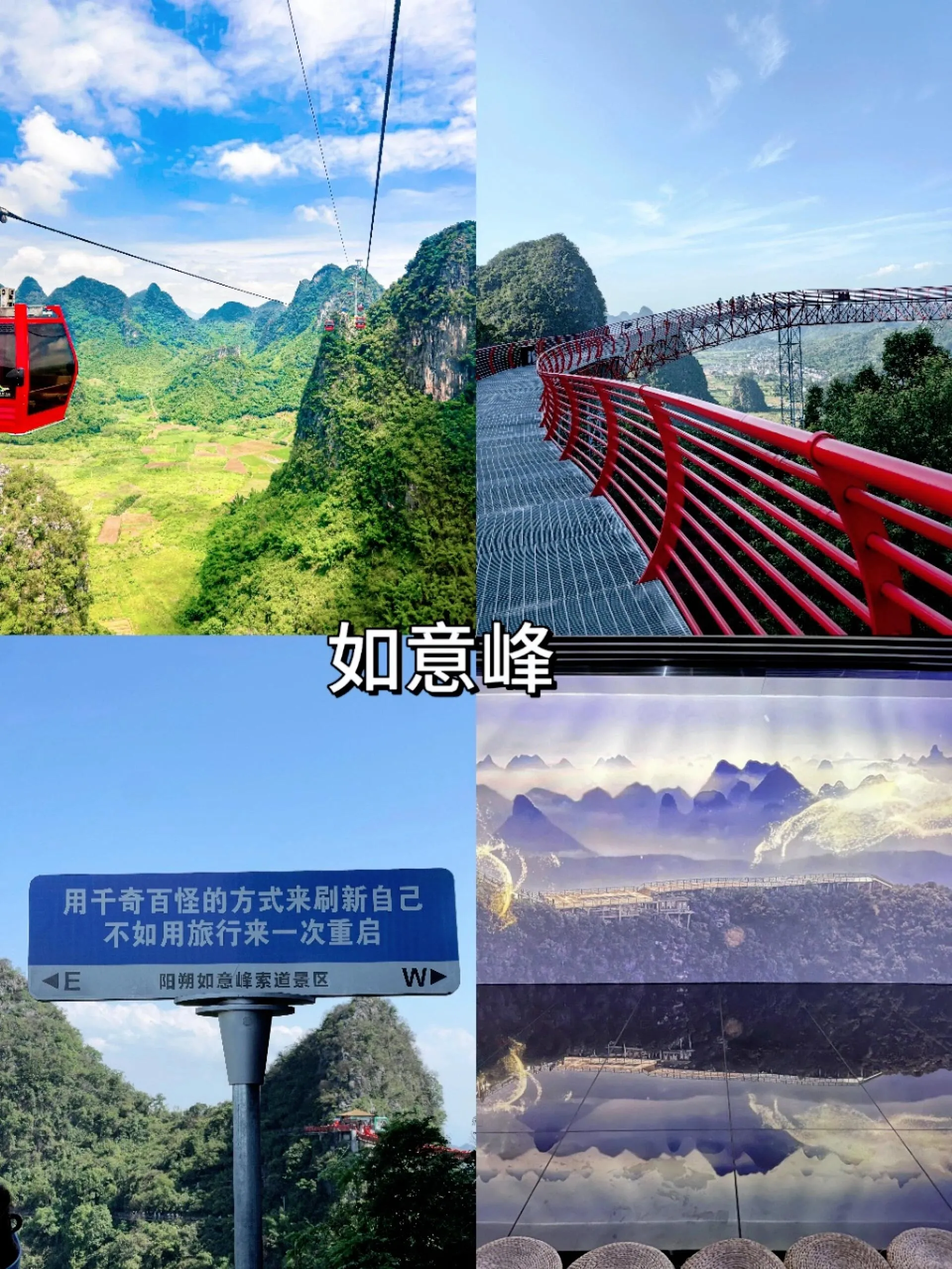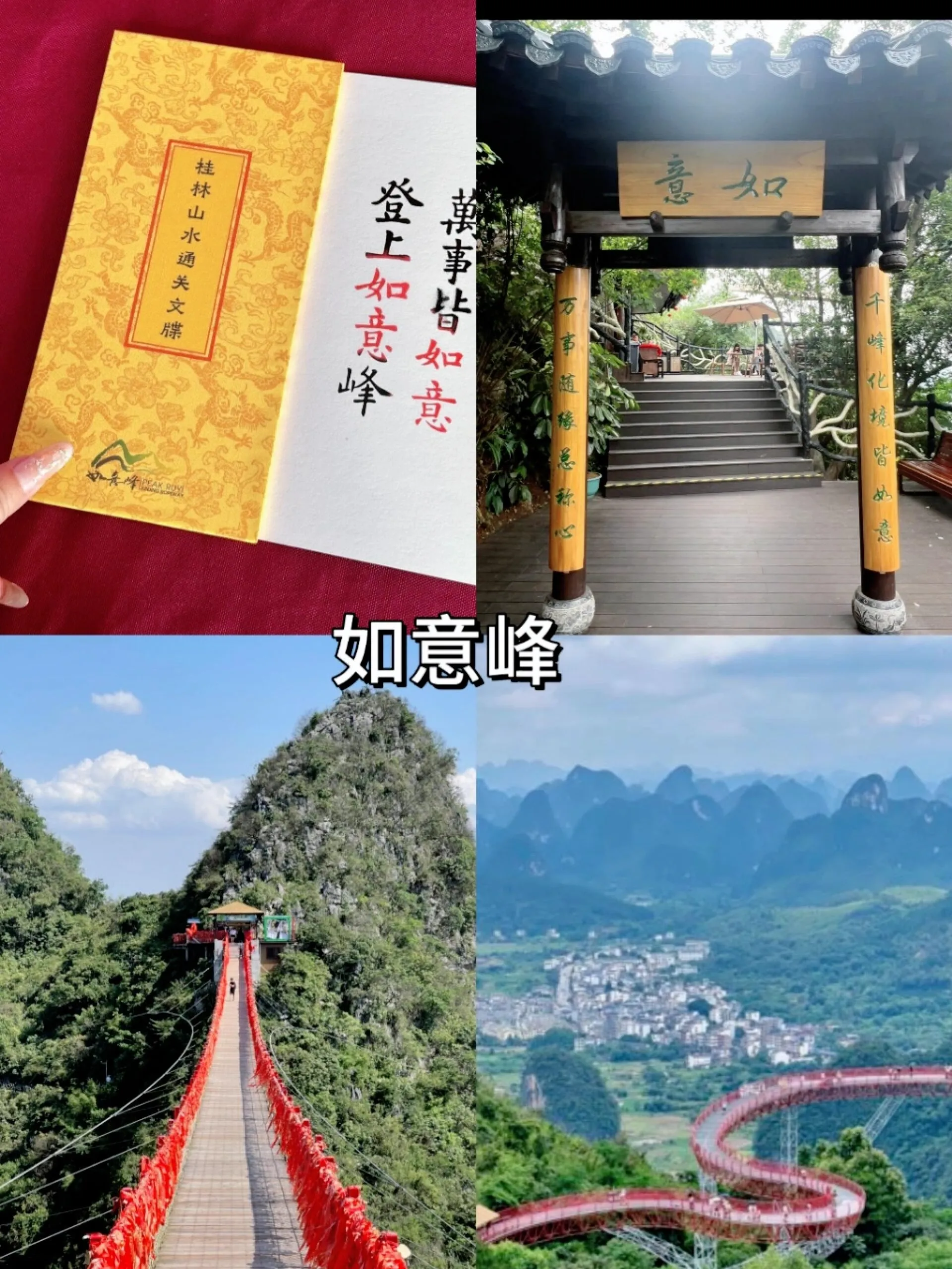 这里堪称人间仙境。乘坐缆车缓缓上升,沿途可见连绵起伏的山峦和郁郁葱葱的树木,远处缭绕着如梦如幻的云雾,美景令人震撼。如意索桥上挂满红色祈愿布条,是拍照的绝佳地点。在如意云顶可以360度欣赏阳朔山水,玻璃栈道则带来刺激惊险yet难忘的体验。值得一提的是,在遇龙河十里画廊附近的几个地点(如凤鸣旅游集散中心、蝴蝶泉景区、工农桥综合码头、金水岩景区公交站)都可以凭门票乘坐免费直通车前往景区,非常方便。