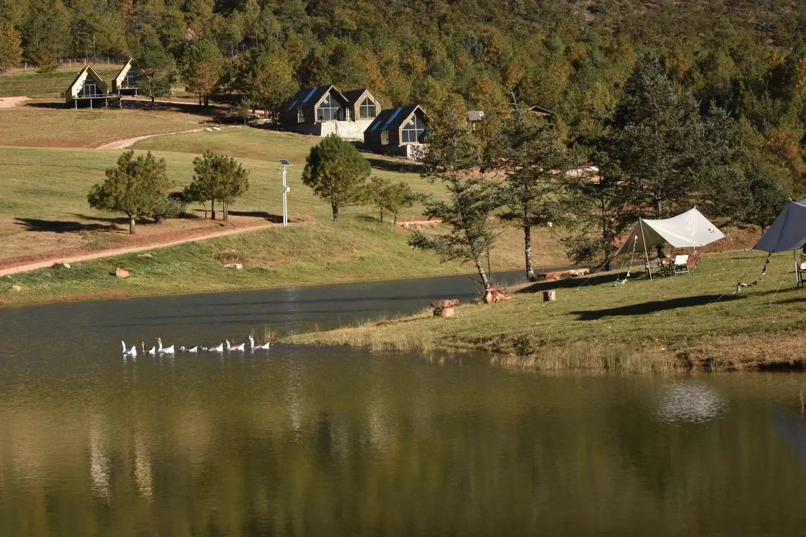当我看到桃花坞牧场时,顿时有点惊艳。整个牧场坐落在玉龙雪山的山脚下,四周都是山脉。山上的泉水自上而下汇集在平原的牧场,自然形成的湖水让整个牧场更有了灵动感,特别是风吹过,大白鹅游过的时候。牧场还有很多动物,有马、小牛犊、棉羊、鹅,还有野生的小动物在你不经意间出没。一起入住的坞友在我们房门口甚至发现了小鹿。这里真的实现了我想住在大自然里的想法!