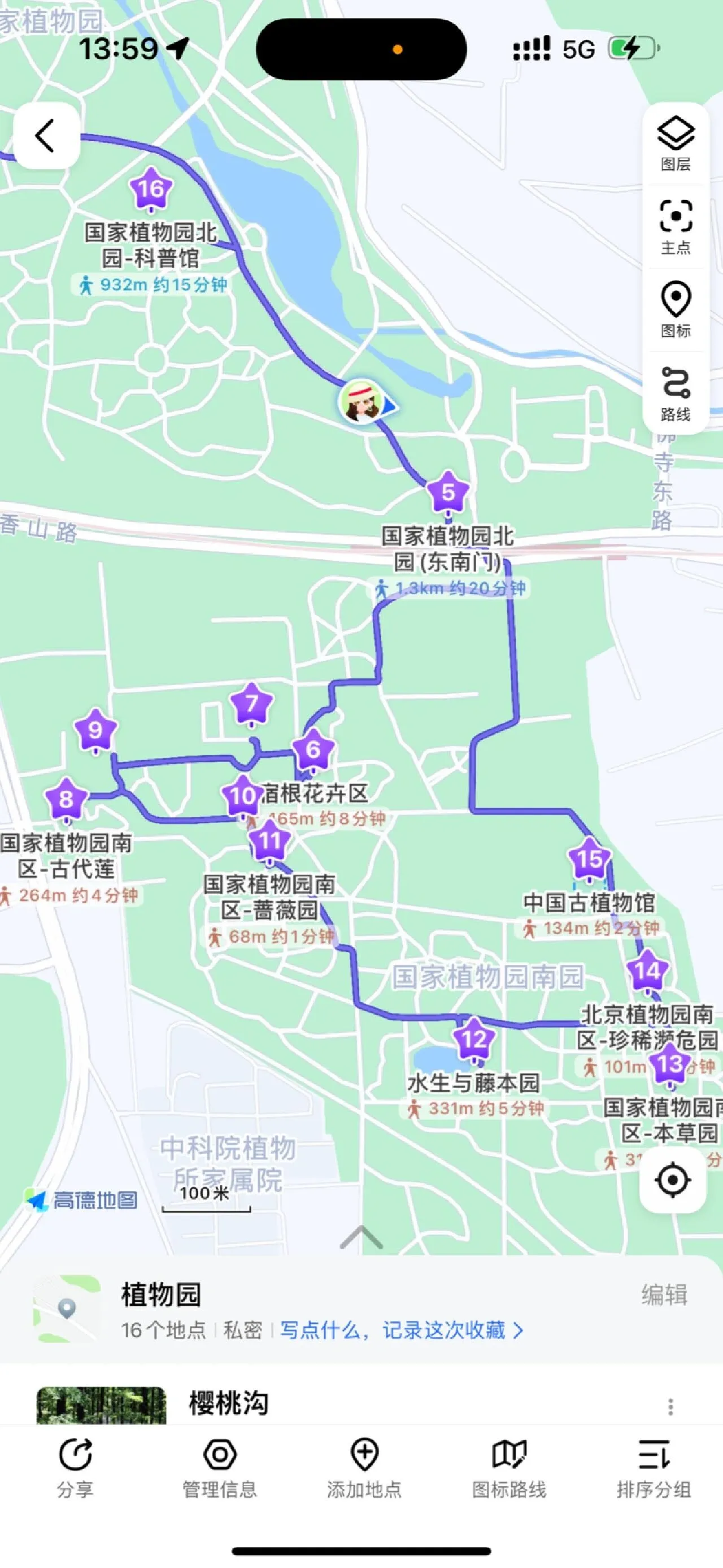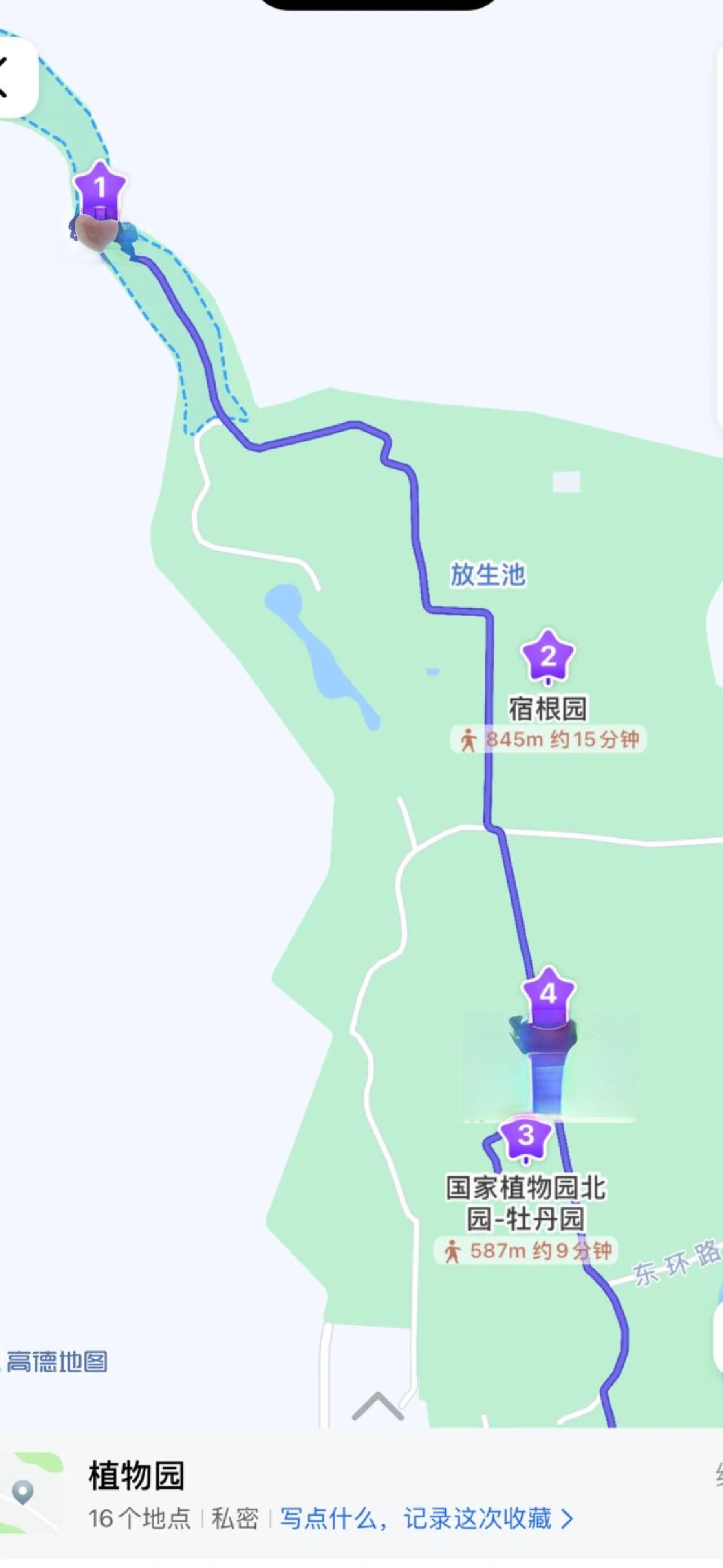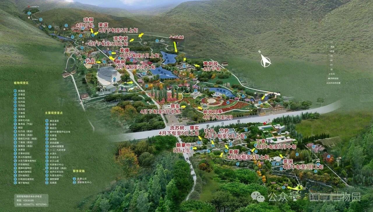我的游览路线是:从北园东南门进入,乘坐摆渡车到卧佛寺,然后依次游览了樱桃沟(有水杉喷雾)、宿根园(可以看到珙桐、木绣球、铃兰、鹅掌楸)、丁香园、牡丹园、郁金香花园(有猬实)。之后前往南园,游览了宿根花卉区(有鸢尾和铃兰)、展览温室、香山植物园宿舍附近(有猬实)、古代莲附近(有鹅掌楸)、水生与藤本园(可以看到忍冬、流苏、泡桐)、草本园、珍稀濒危园(有猬实)和古植物园,最后从北园南门离开。