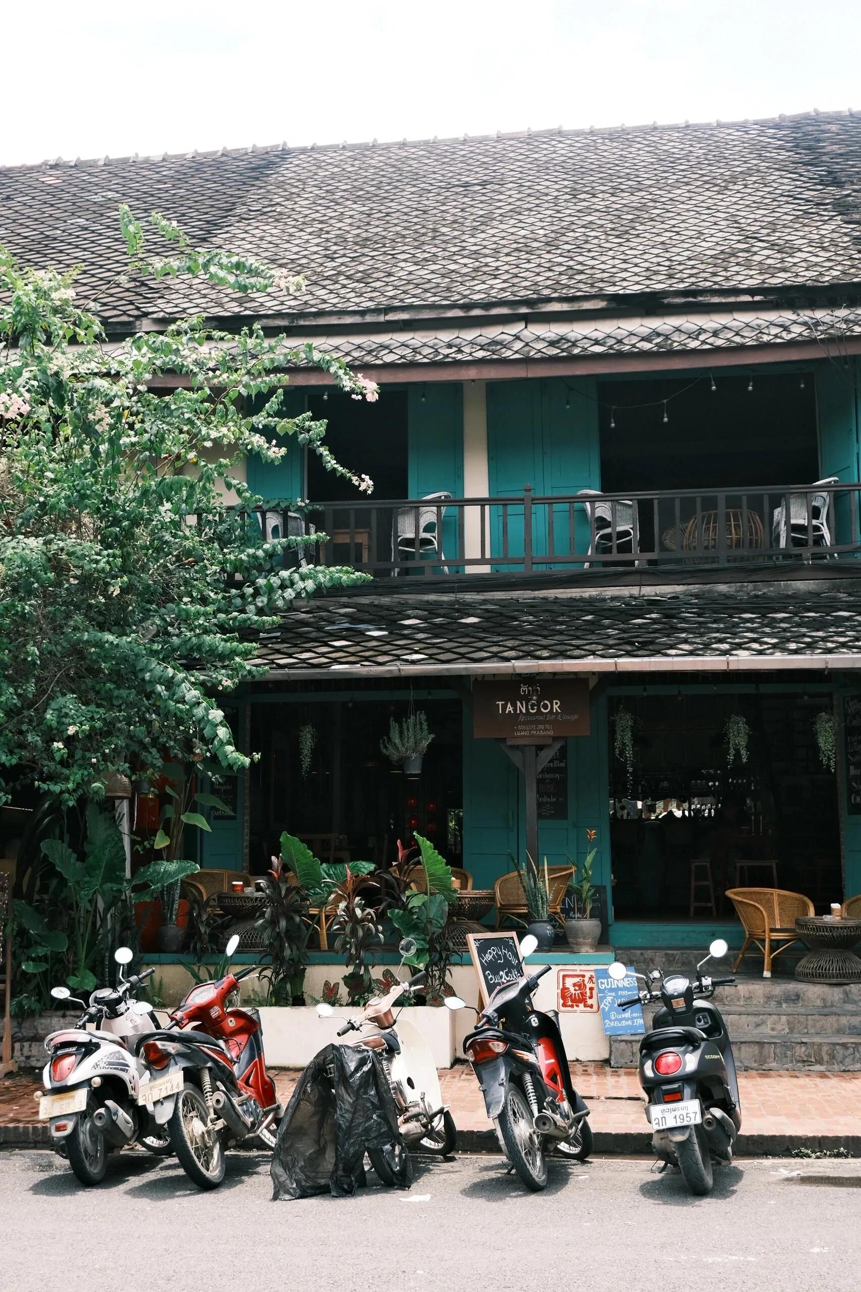 白天的琅勃拉邦主街安静整洁,沿着一条直街就能到达湄公河边,主街的众多小巷也通向河边。由于曾是法国殖民地,这里保留了许多法国元素,有不少法式餐厅。琅勃拉邦的法餐可能是最实惠的,人均50元就能享用一顿。当地的果汁也很便宜,十几块钱一大杯,浓郁可口。