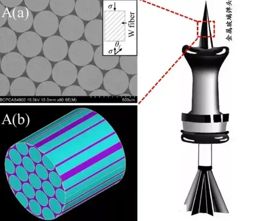 左上为扫描电子显微镜下的第三代金属玻璃弹芯穿甲弹材料,左下为对应的模型,蓝色圆柱代表钨丝,中间的紫色填充物为锆基金属玻璃