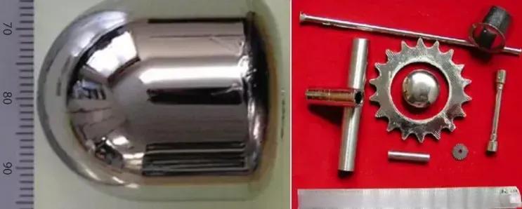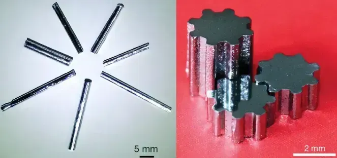 左图为铱镍钽金属玻璃的圆柱形棒材,右图为铱镍钽金属玻璃制造的微型齿轮,这些组件能在极其恶劣的环境中应用。