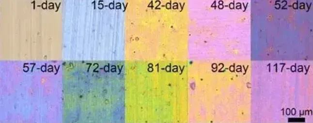 彩色金属玻璃颜色随时间变化的规律,在百余天内,金属玻璃的外观呈现多样颜色变化。