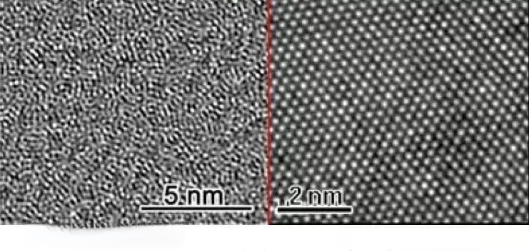金属玻璃和晶态金属的高分辨透射电子显微镜照片对比 ,可以看出金属玻璃的原子排列无序,而晶态金属则是规则排列。