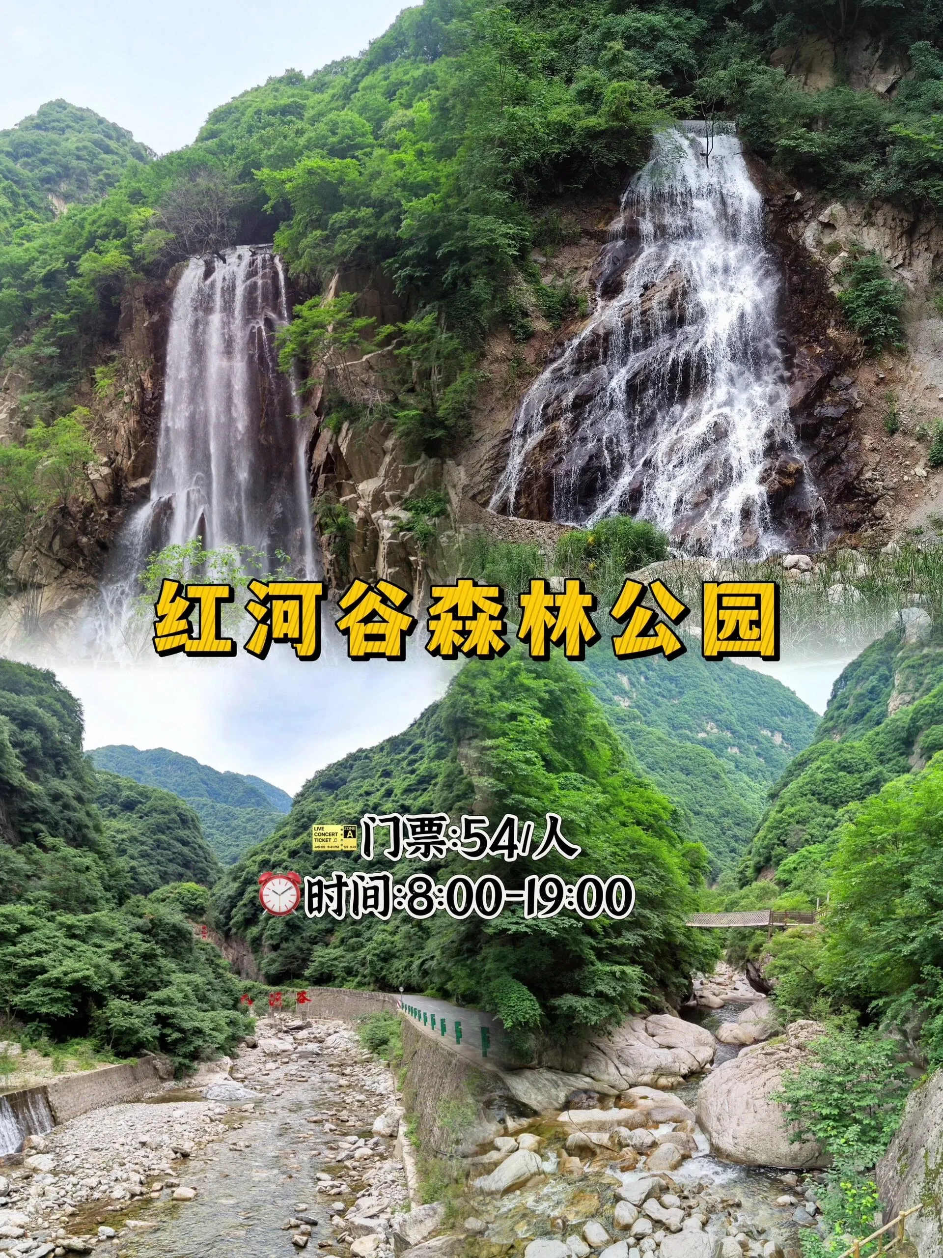 门票54元/人,开放时间为8:00-19:00。这里是集山水风光为一体的大自然宝藏地,瀑布飞流直下,环境优美凉爽。游玩路线可以选择驾车或徒步,驾车游玩的线路约有7公里的距离。
