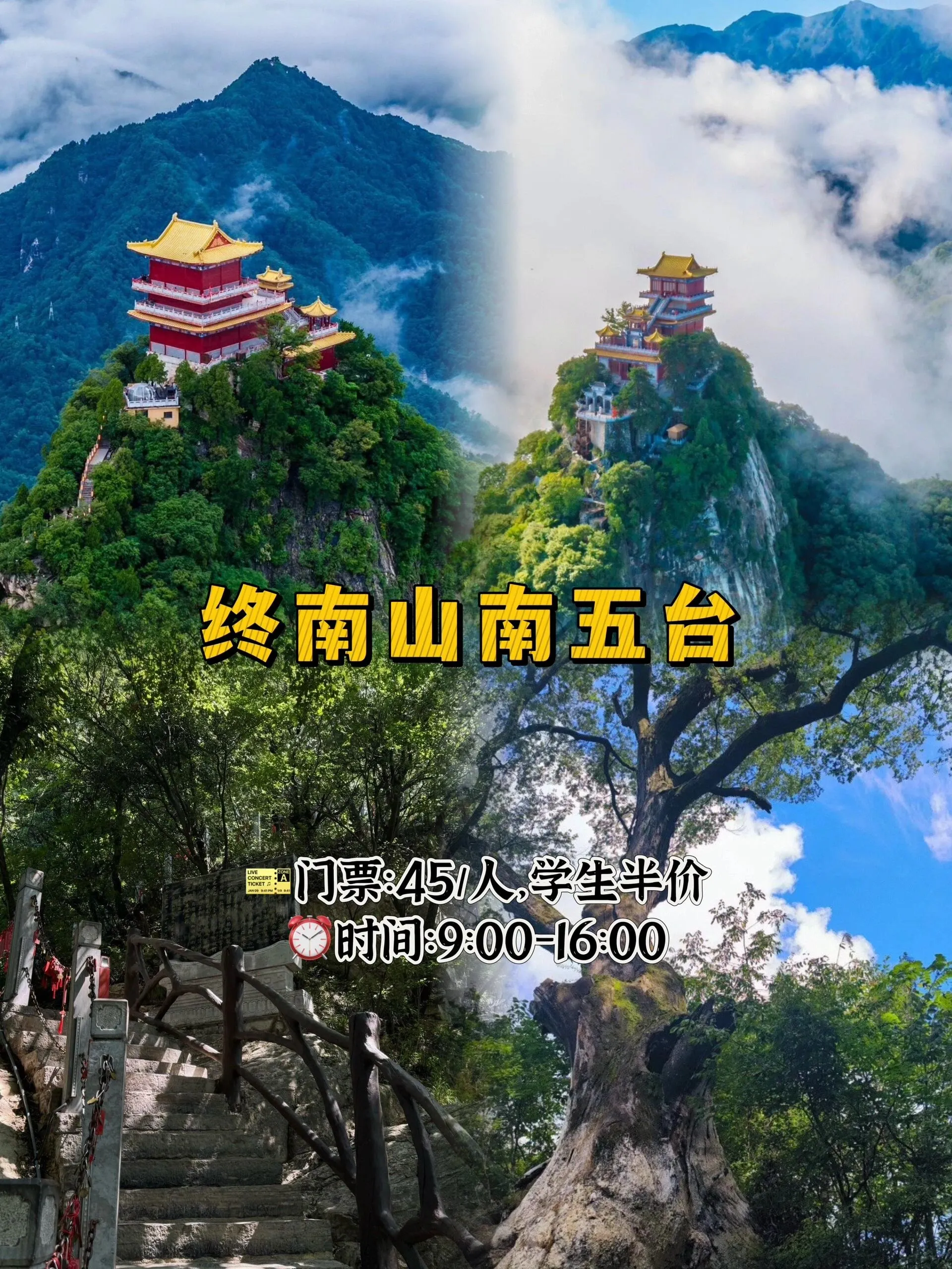 门票45元/人,学生22元/人,开放时间为9:00-16:00。爬到半山腰会偶遇很多小庙,还有一颗李世民亲手种下的千年古树,非常有历史感。