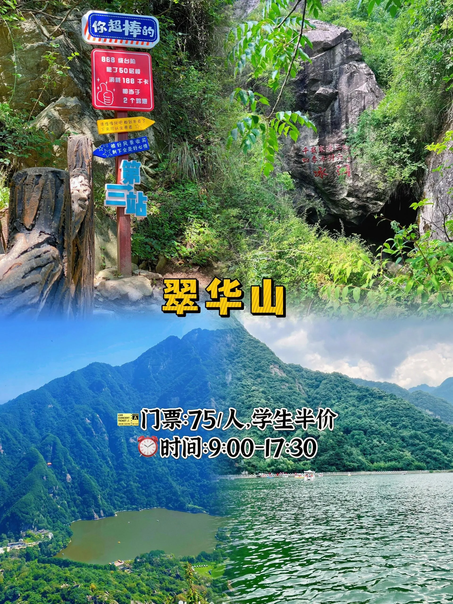 门票75元/人,学生半价,开放时间为9:00-17:30。在天池打卡推荐坐游船,有一种小桂林的感觉。坐船往上走就是冰冻风洞,建议带外套,因为里面挺冷的。