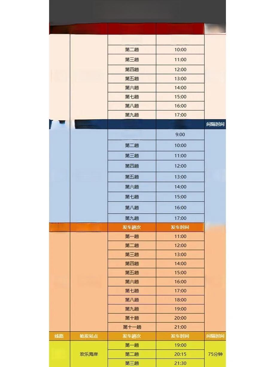 运行时间方面,红线和蓝线在9:00-15:00运行,橙线11:00-21:00,黄线19:00-21:30。值得注意的是,红线和黄线路线有较多重合,一个在白天运行,一个在晚上运行。