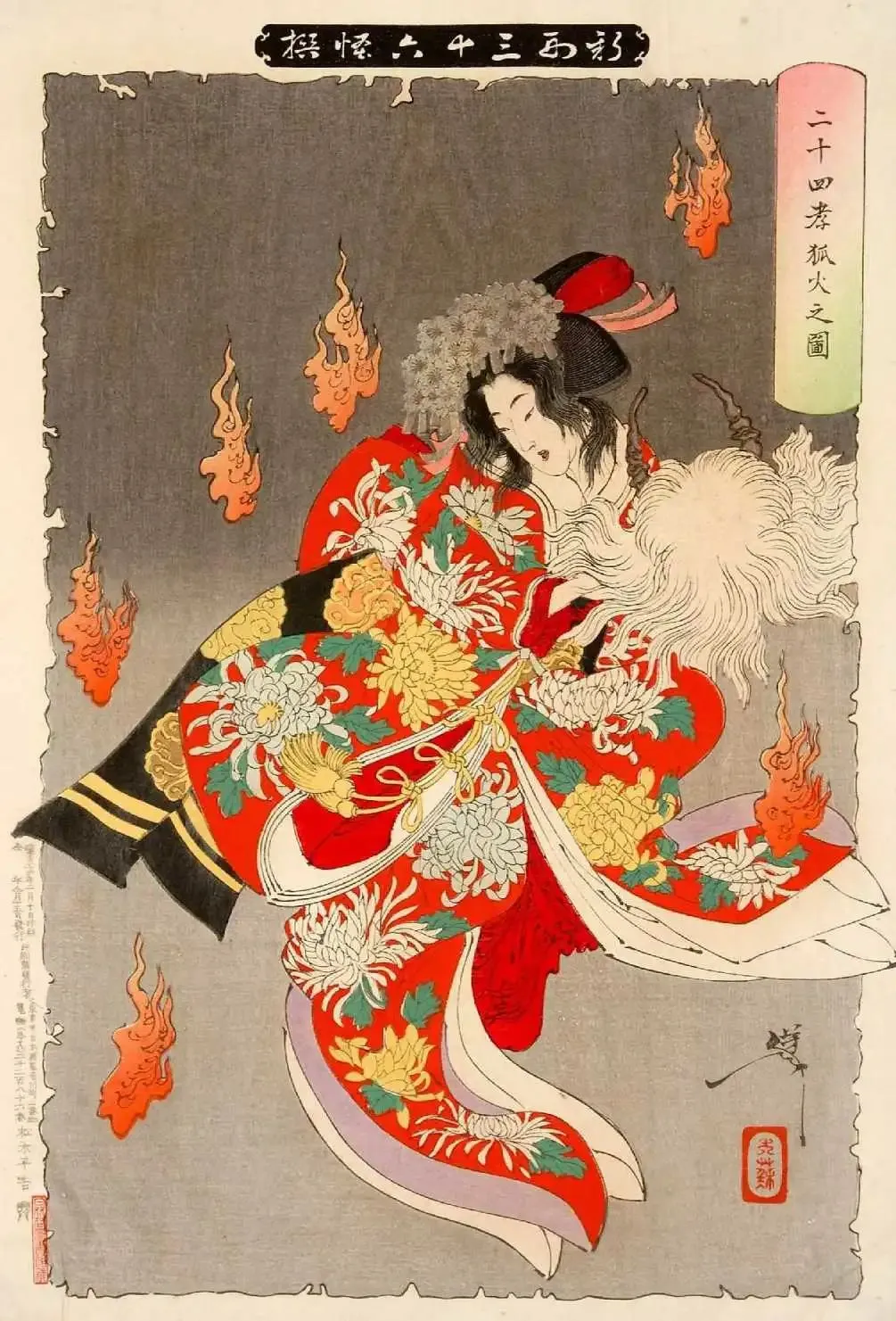 下右:月冈芳年《新形三十六怪撰 二十四孝狐火之图》