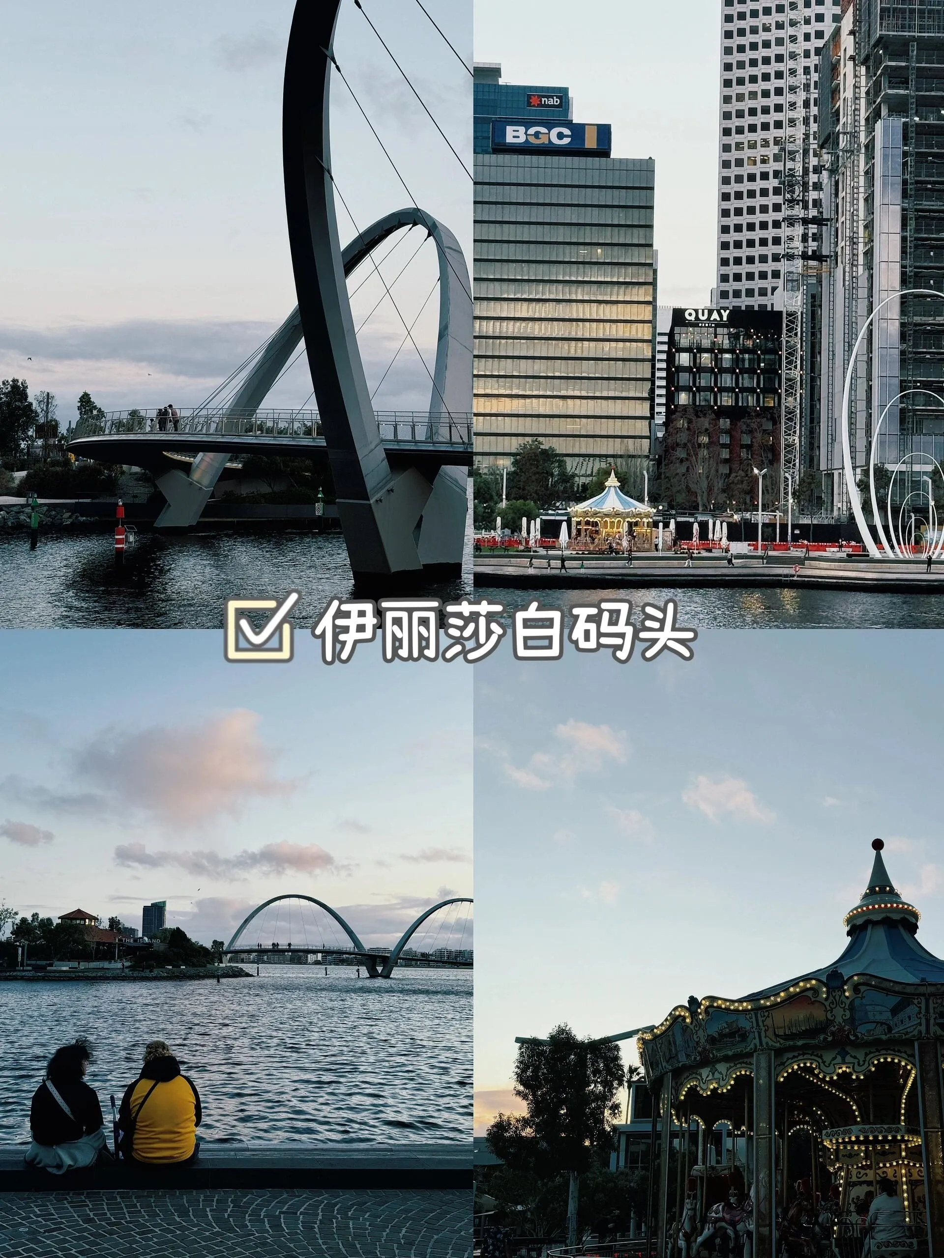 伊丽莎白码头(Elizabeth Quay) 是欣赏夜景的绝佳地点。夕阳映射在高楼的幕墙上,景色格外灿烂。这里还可以乘船前往河对岸,或者体验一下旋转木马的乐趣。