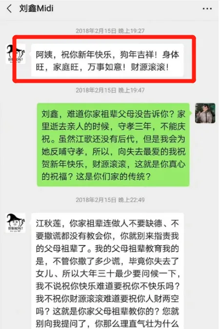 在江母为江歌守孝期间,故意在新年祝福江母家庭旺,辱骂江母,揭“失去女儿”的伤疤。