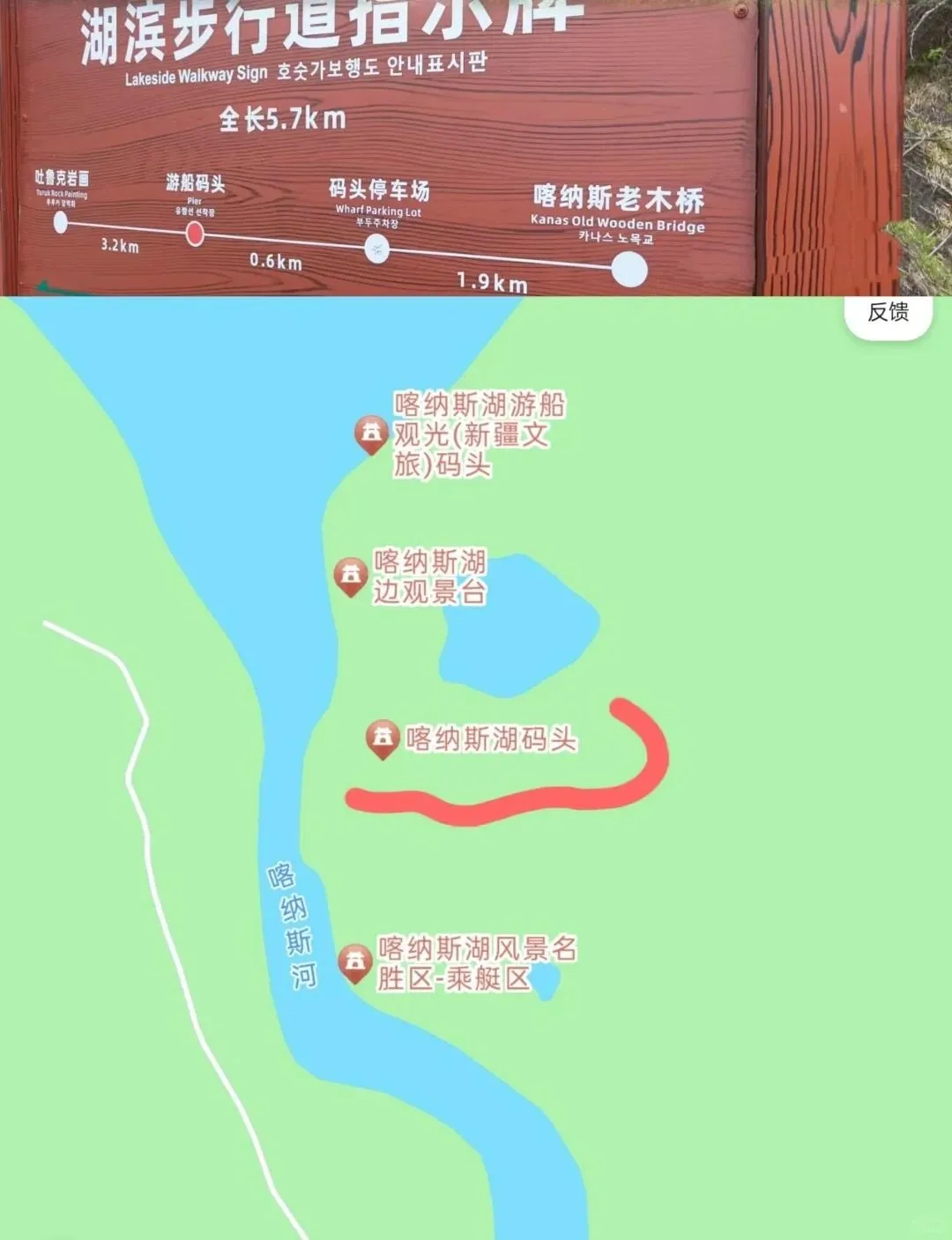 从“游客中心”出发,选择通往“喀纳斯湖”的线路。下车后按指示牌前往“喀纳斯湖码头”。到达码头后向左走。