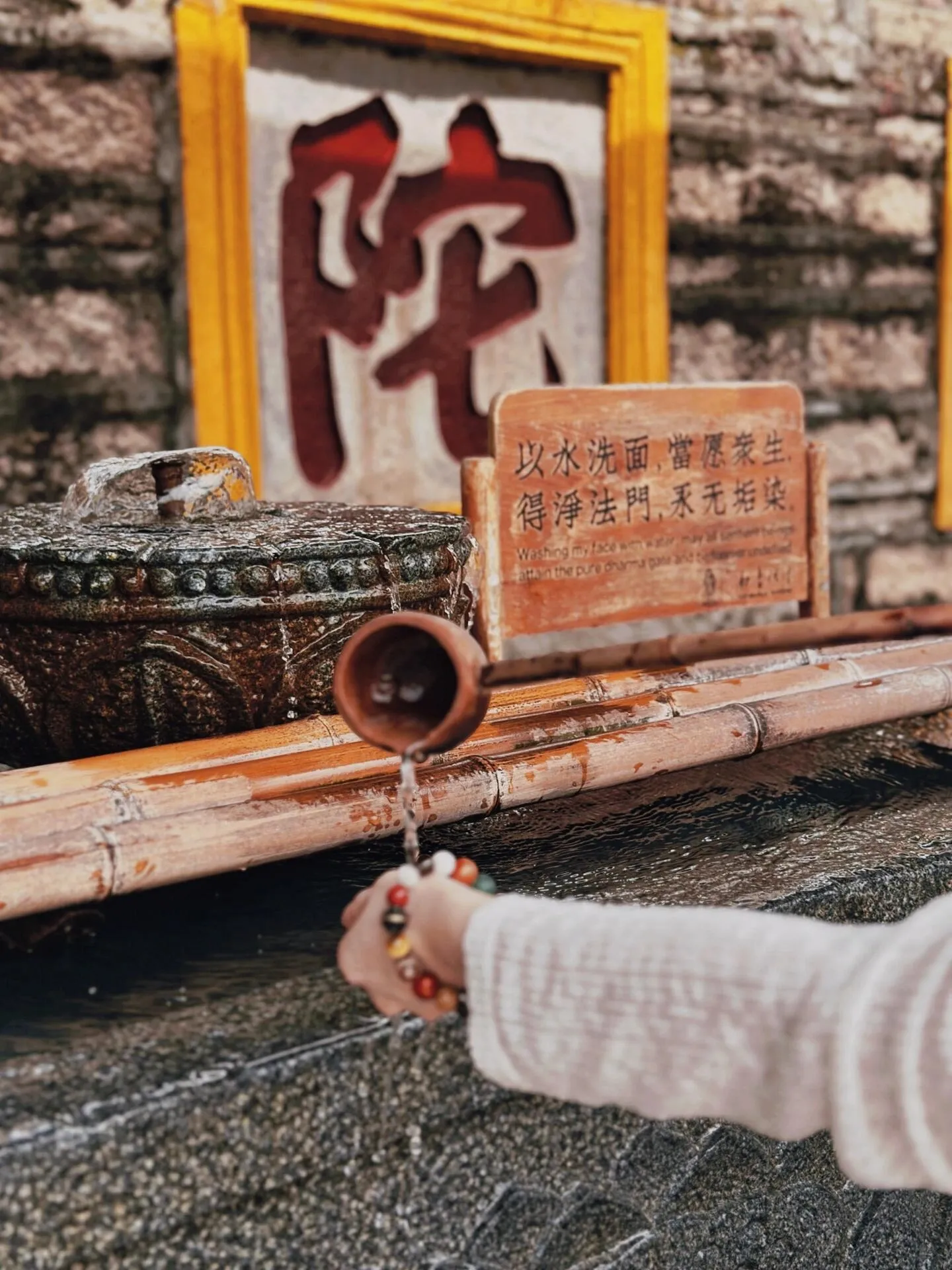 净手:天王殿前有专门的净手池,配有可爱的小竹勺。