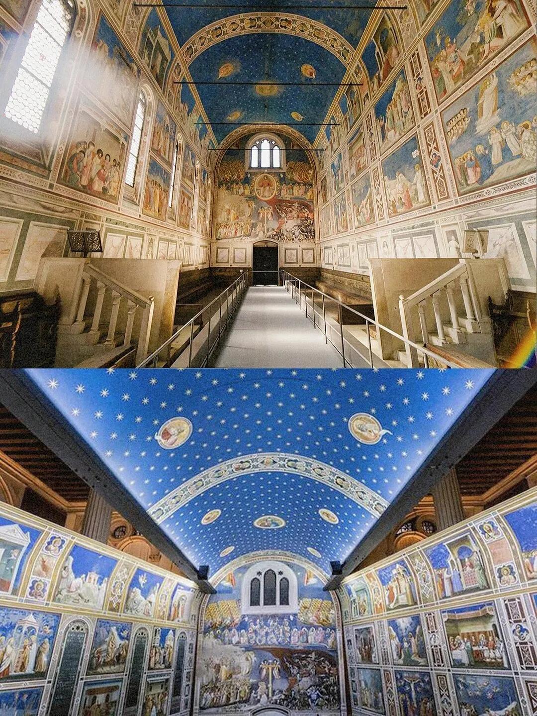斯科洛文尼礼拜堂是帕多瓦最引人注目的景点之一。虽然外表平凡,但内部却藏有欧洲绘画之父、文艺复兴大师乔托的壁画杰作。置身礼拜堂,你会被蓝幕天顶和群星涌动的场景所震撼,这是乔托创作的38幅连环宗教故事。其中最著名的作品包括《犹大之吻》、《最后审判》和《哀悼基督》,这些湿壁画奠定了乔托在14世纪意大利绘画史上的重要地位。