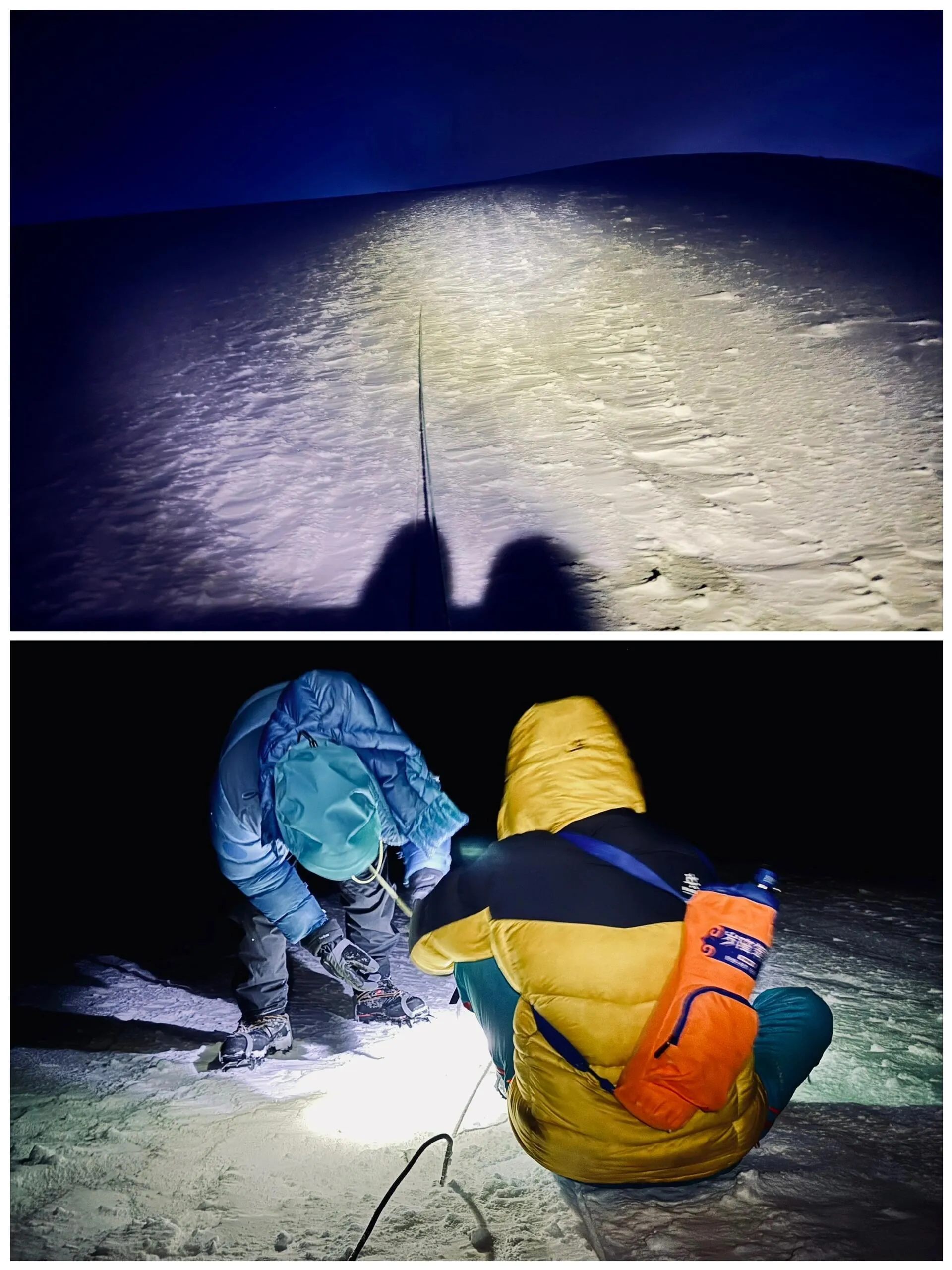 更换干燥衣物后继续攀登,但因鞋袜问题导致脚后跟磨破 ,不得不采取各种奇怪的走路姿势。冲顶时不得不穿着羽绒服+冲锋衣+羽绒服的奇特配置。