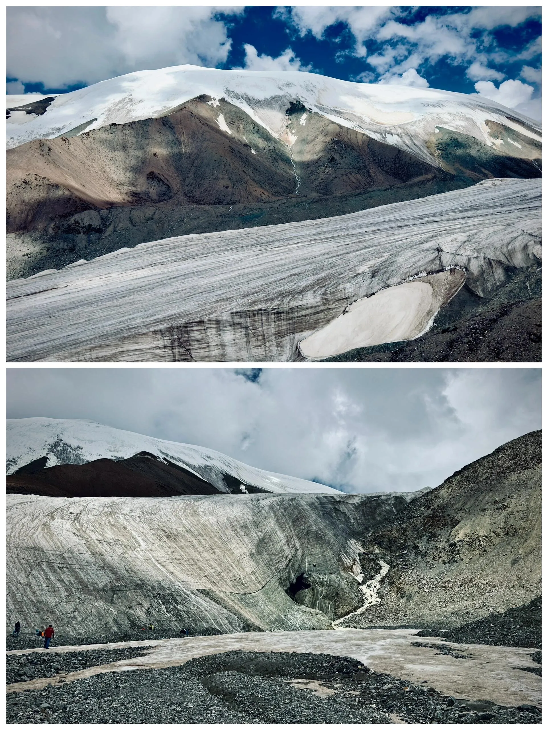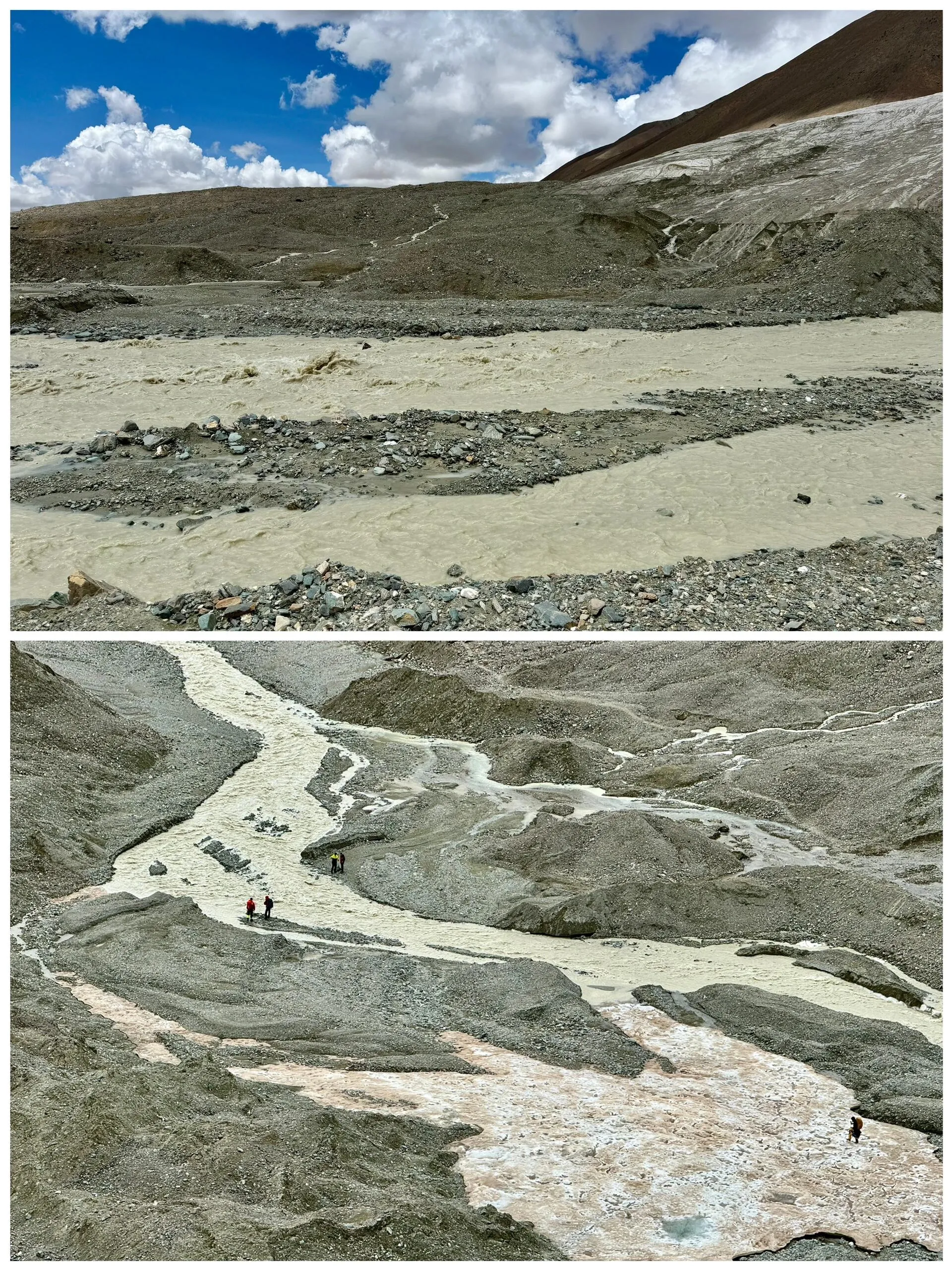 由于天气晴好导致冰川融化,河水上涨,原定过河路段无法通过。 一位穿防水裤的登山者提出可以背人过河,但不幸的是双双摔入河中。 虽然水不深,但衣物全部湿透。